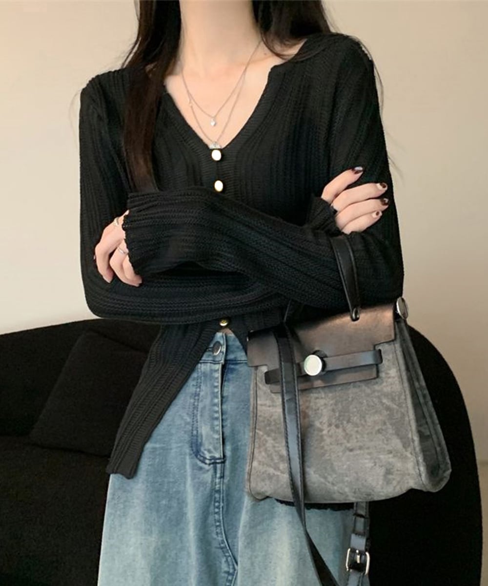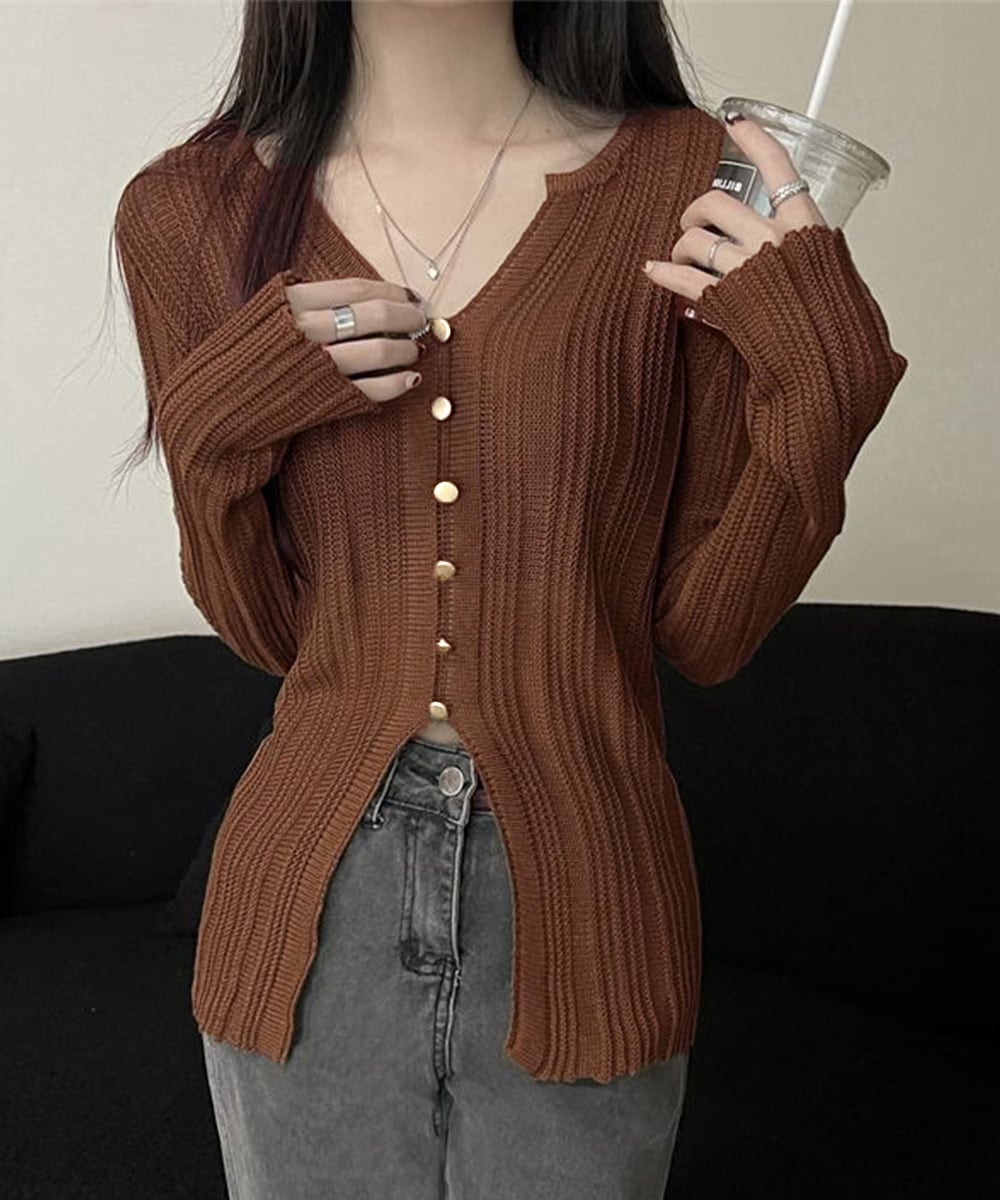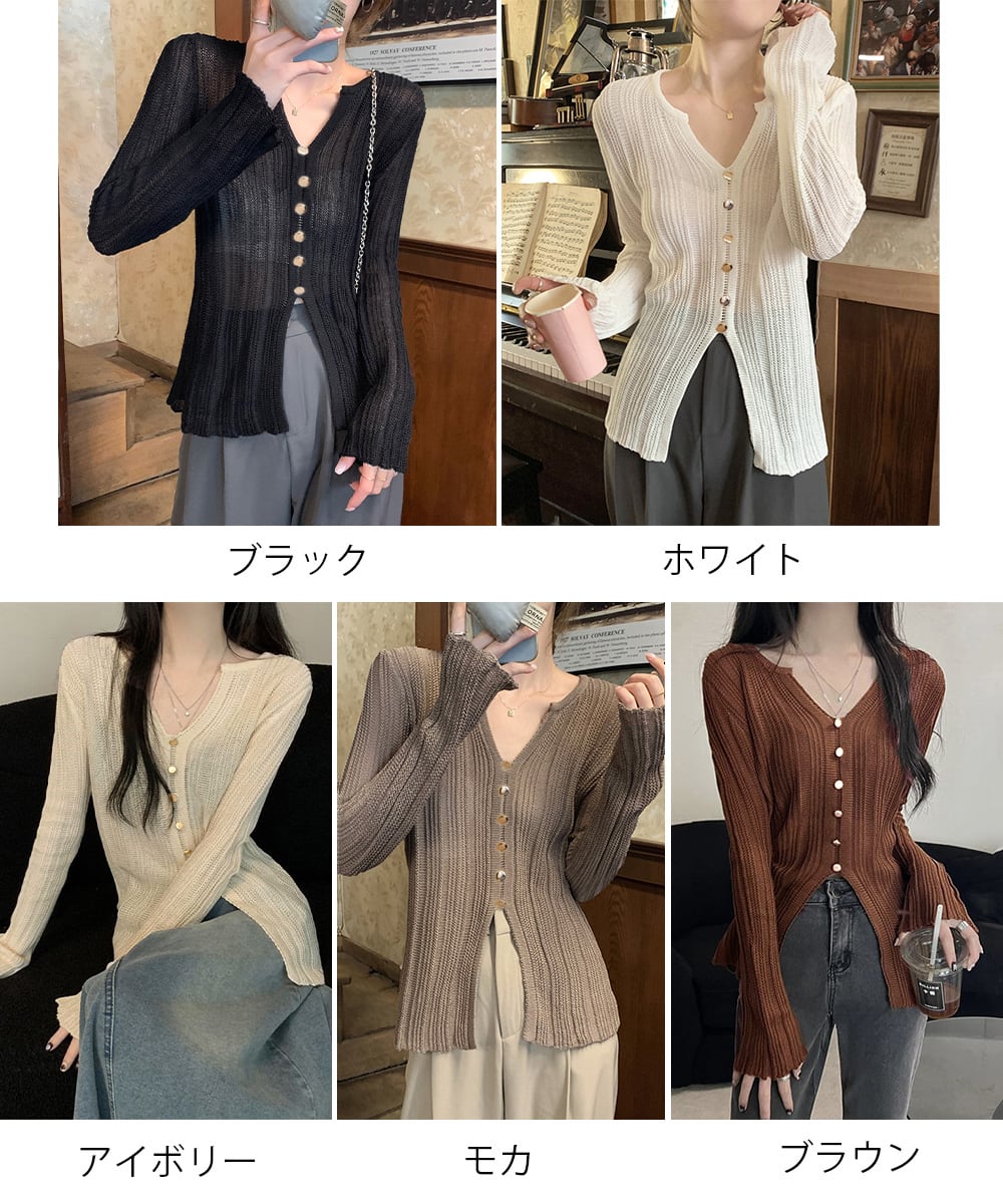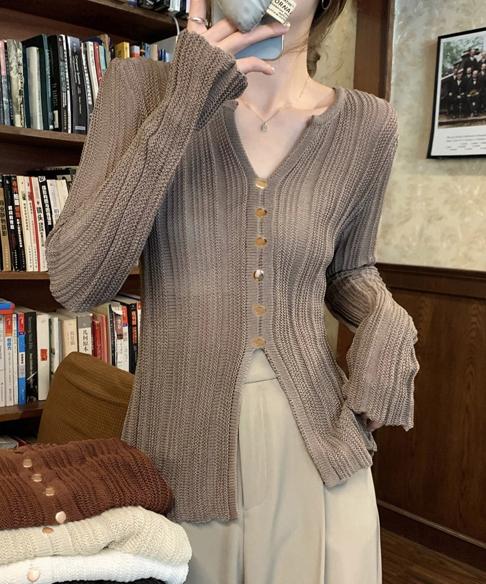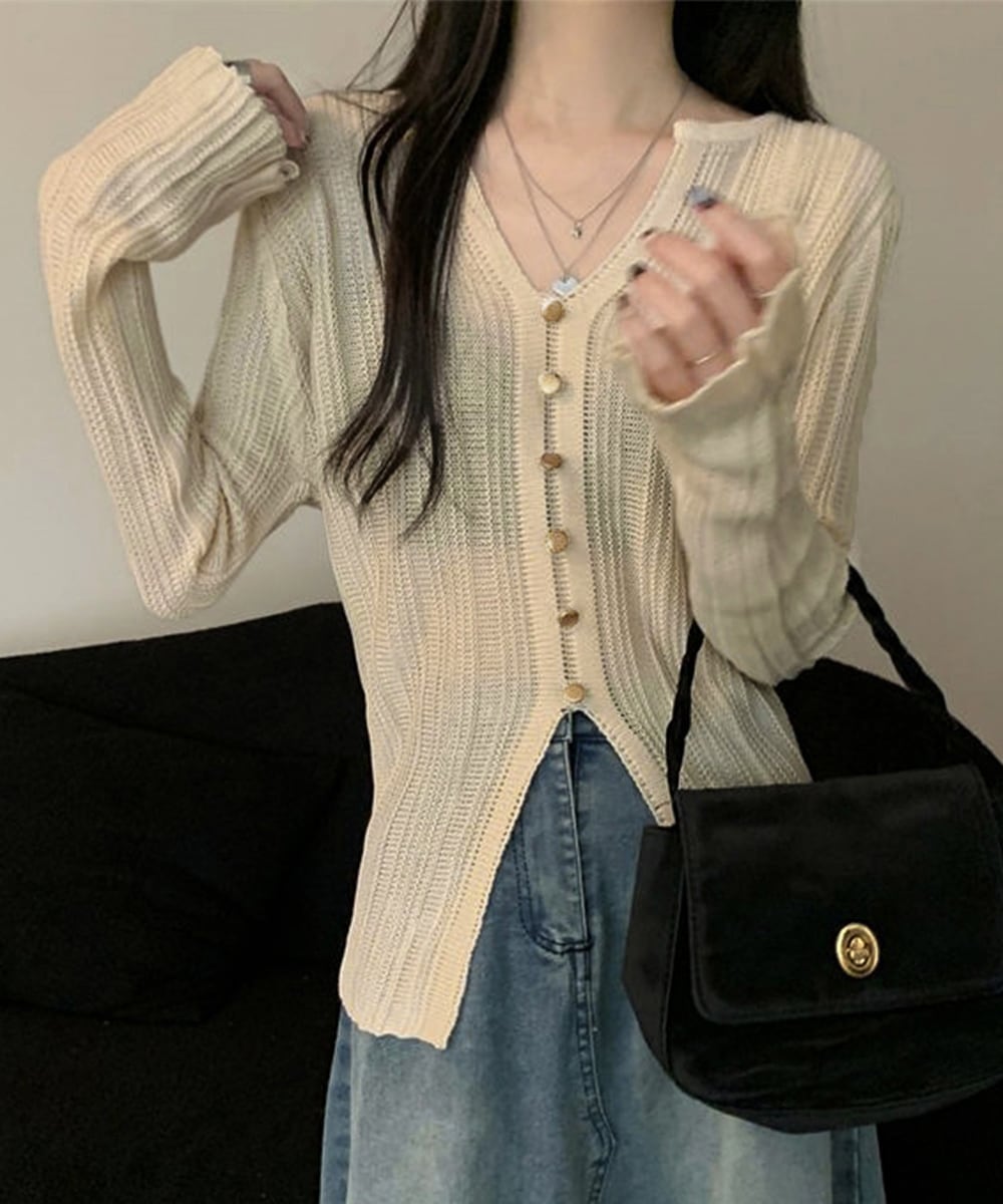 透かし編みVネックニット フロントボタン