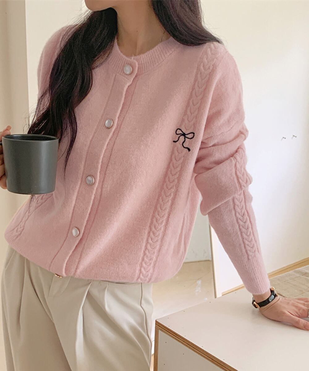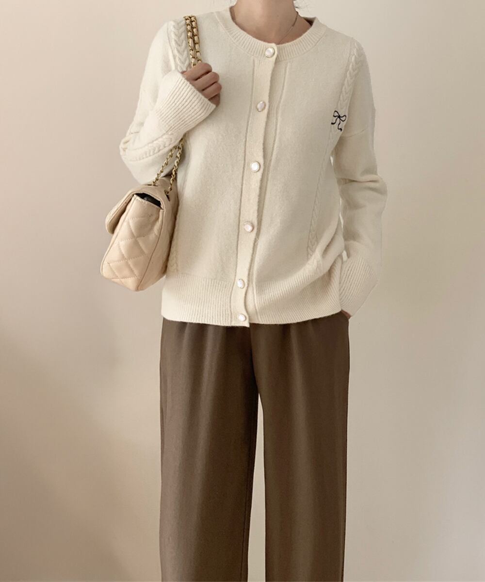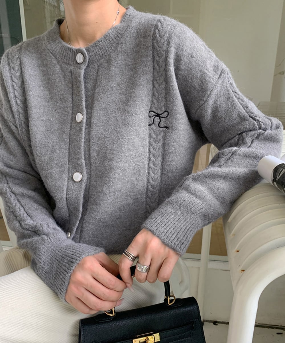 ワンポイントのリボンデザインが目を惹くニットカーディガン。