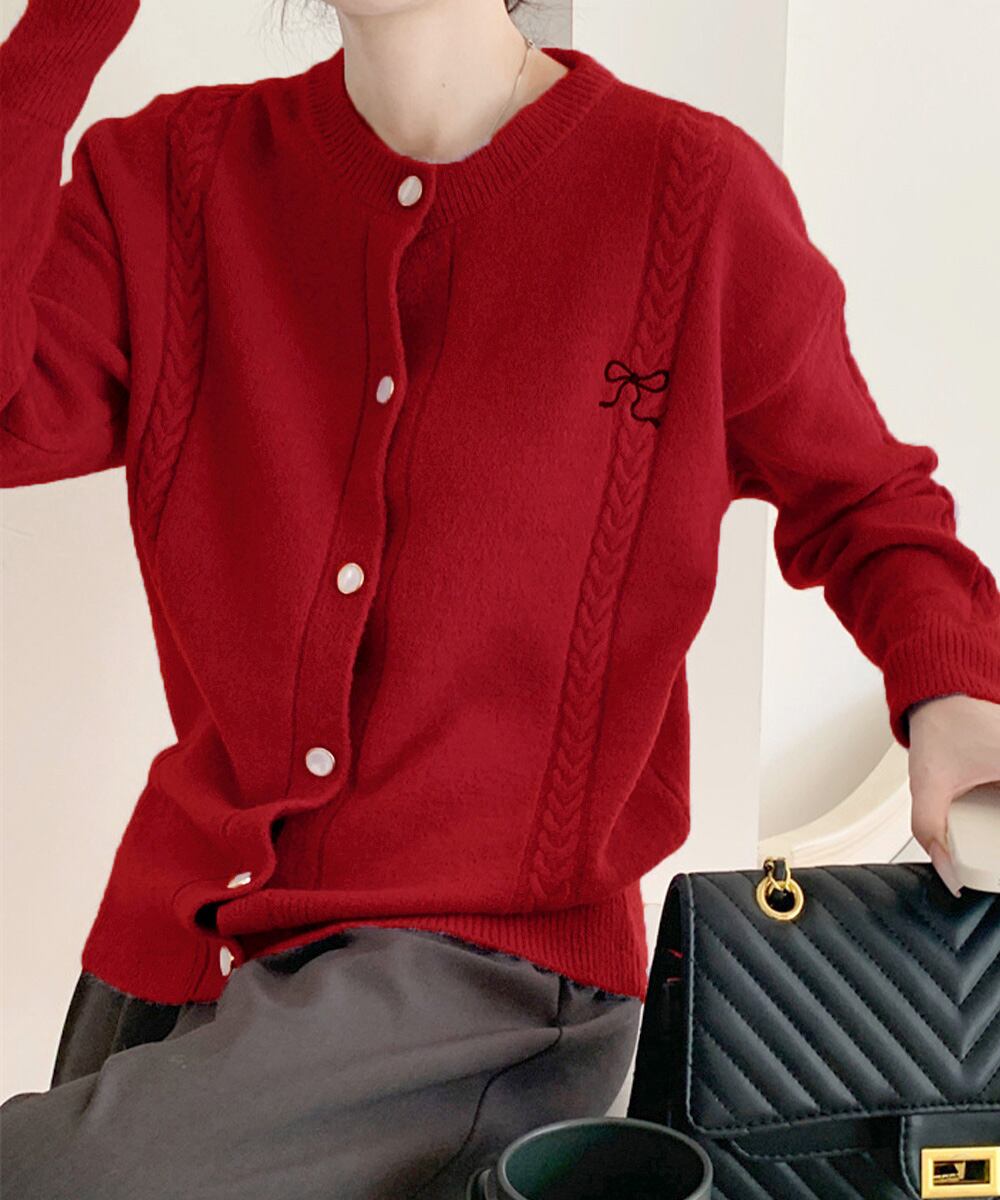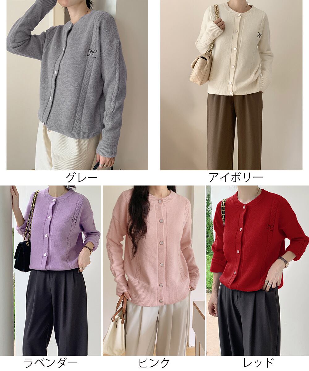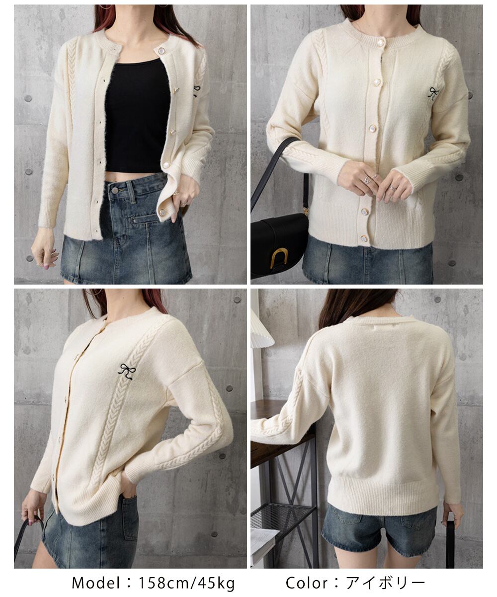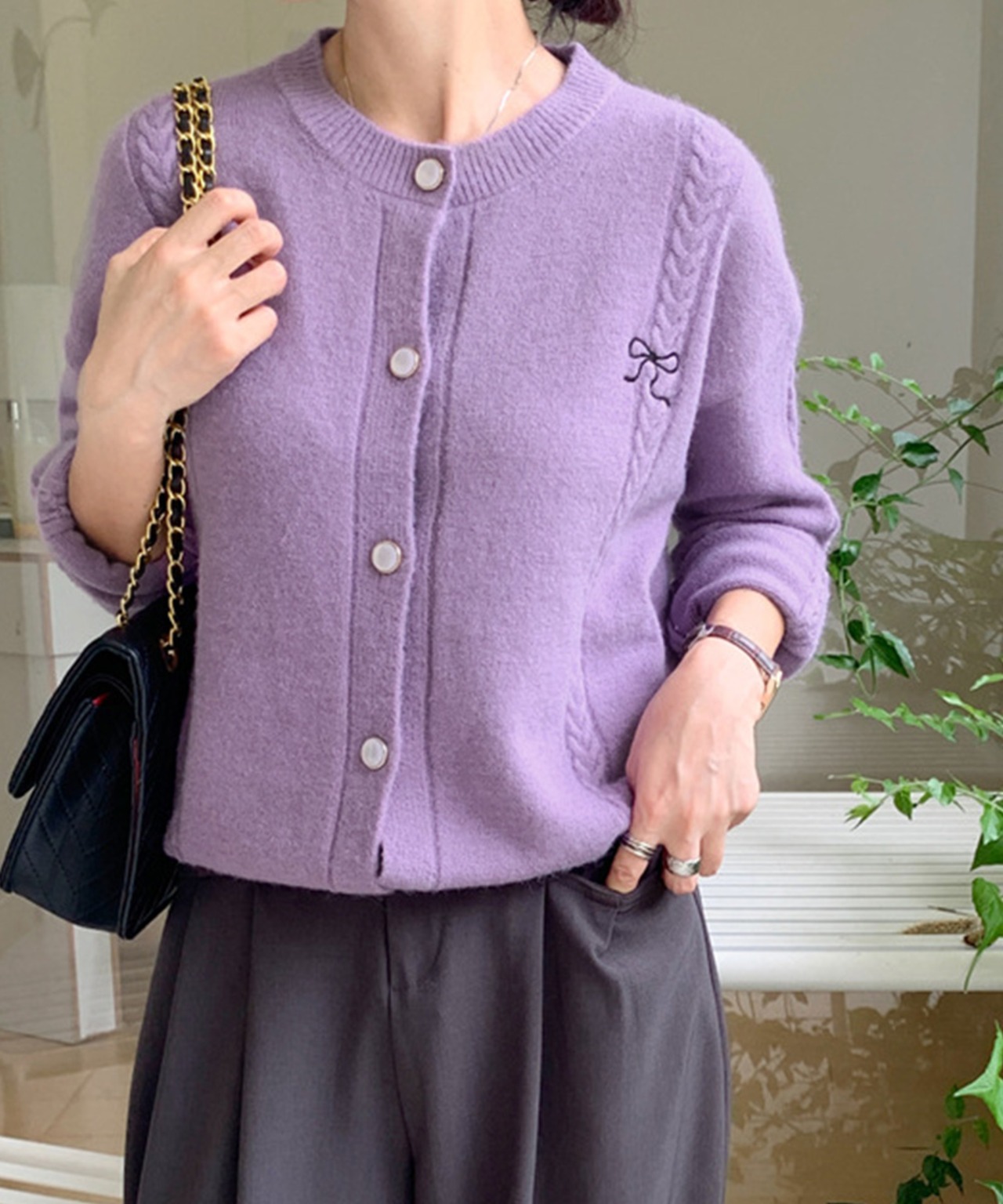 ワンポイントのリボンデザインが目を惹くニットカーディガン。