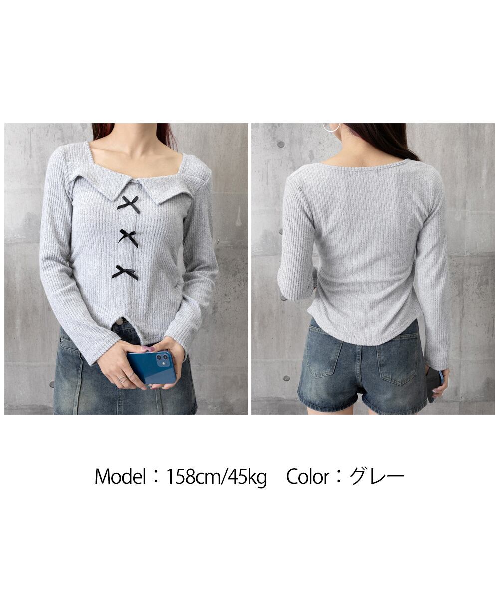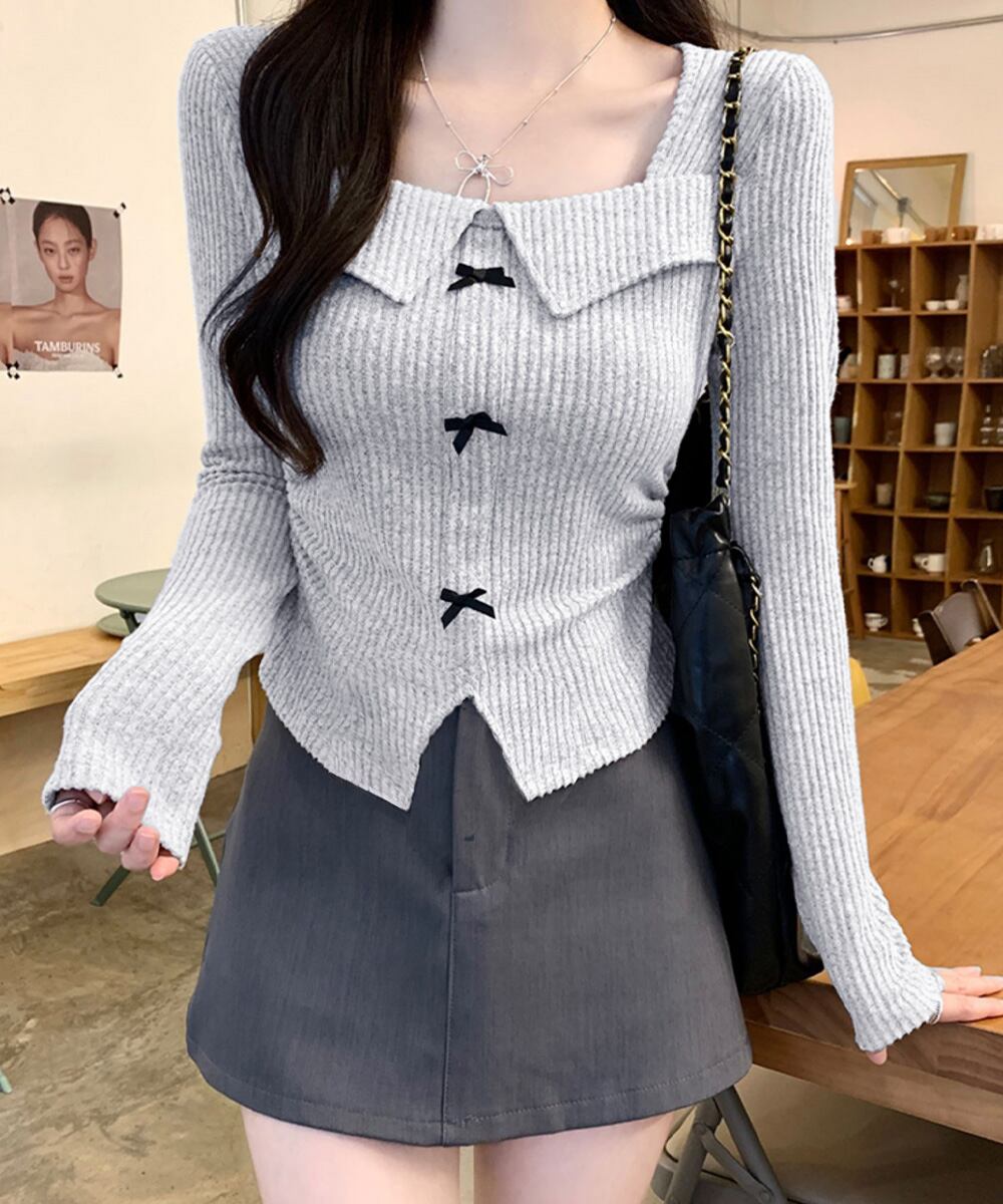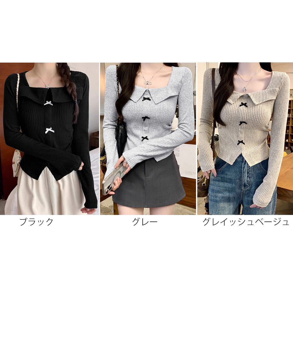リボンニットトップス スクエアネック秋服