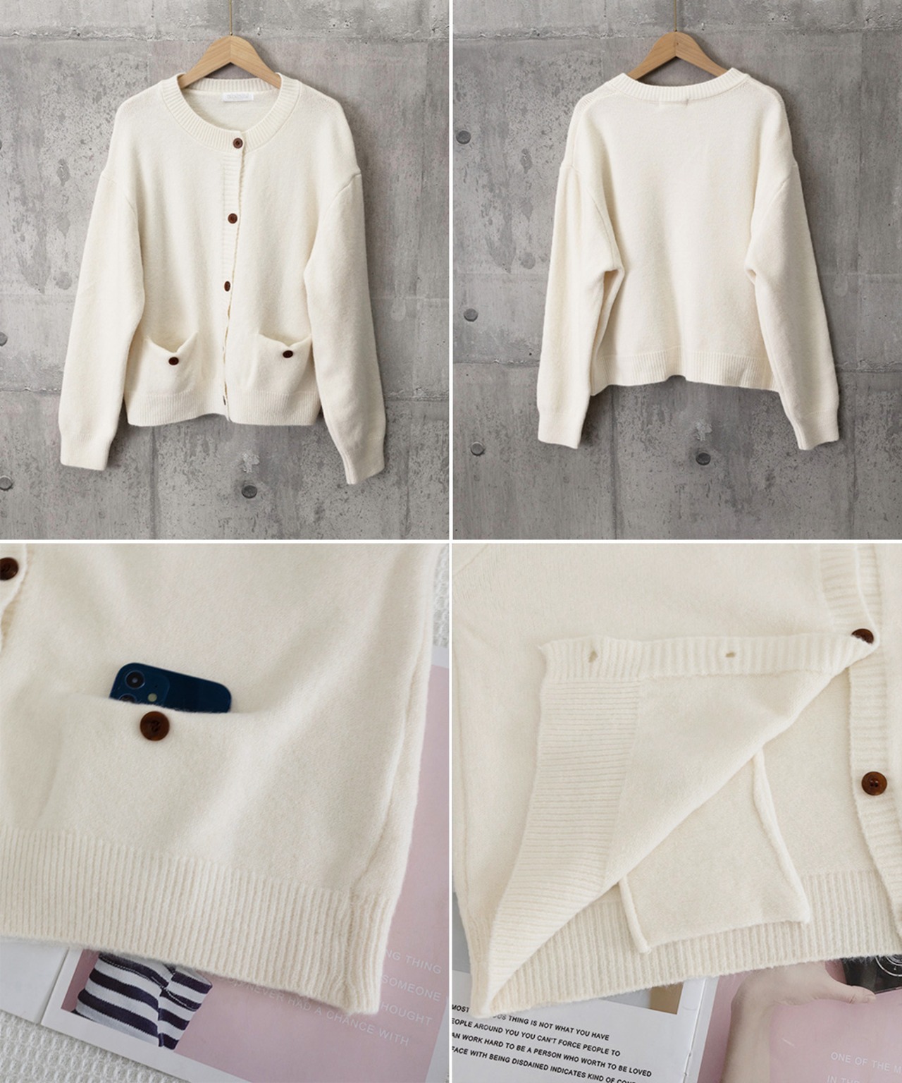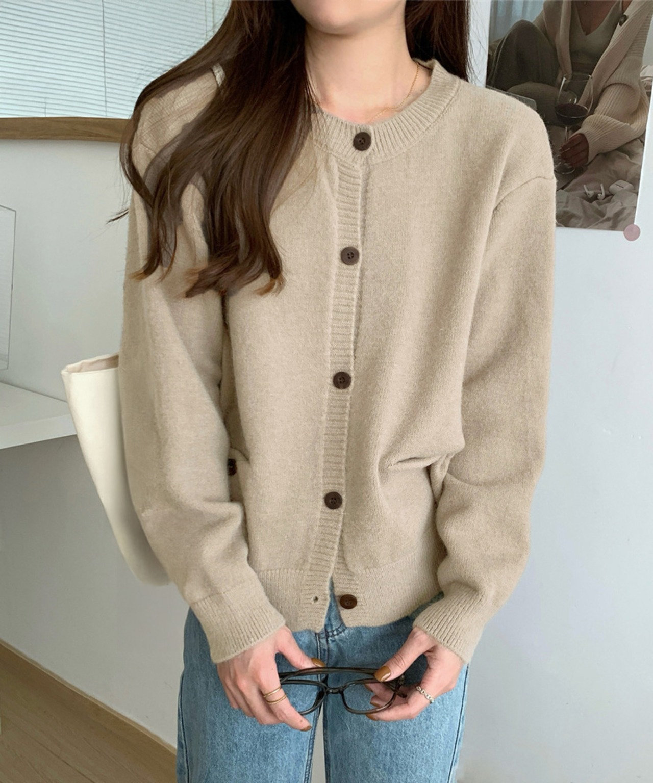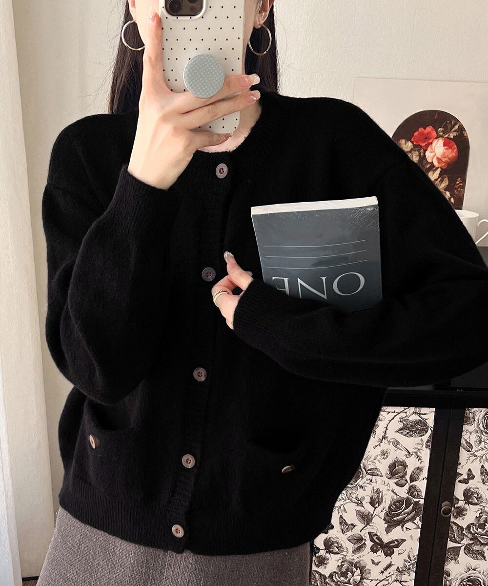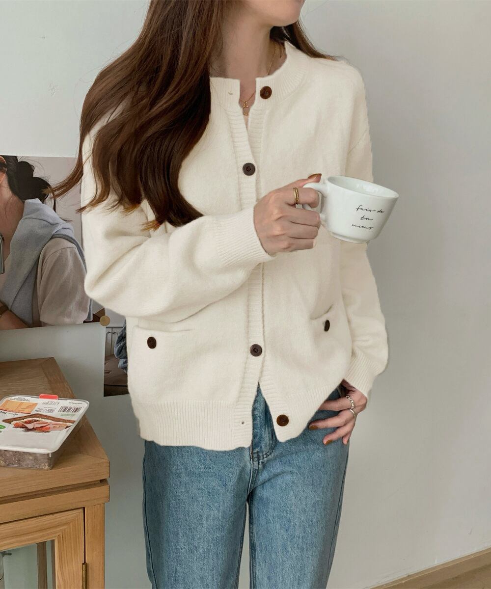 両サイドにポケットが付いた、程よいゆとりのニットカーディガン。