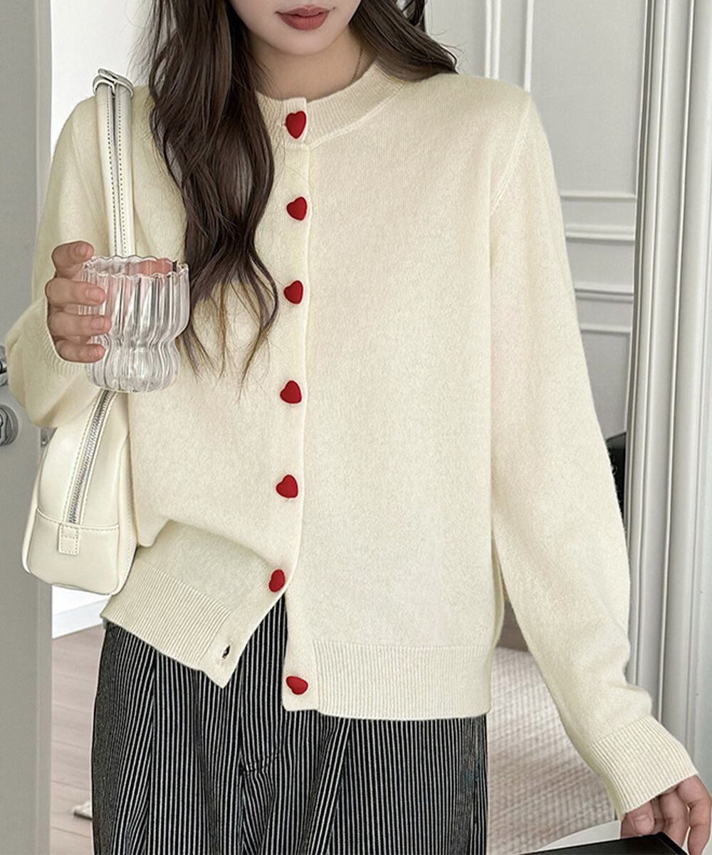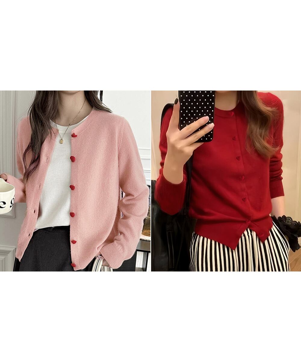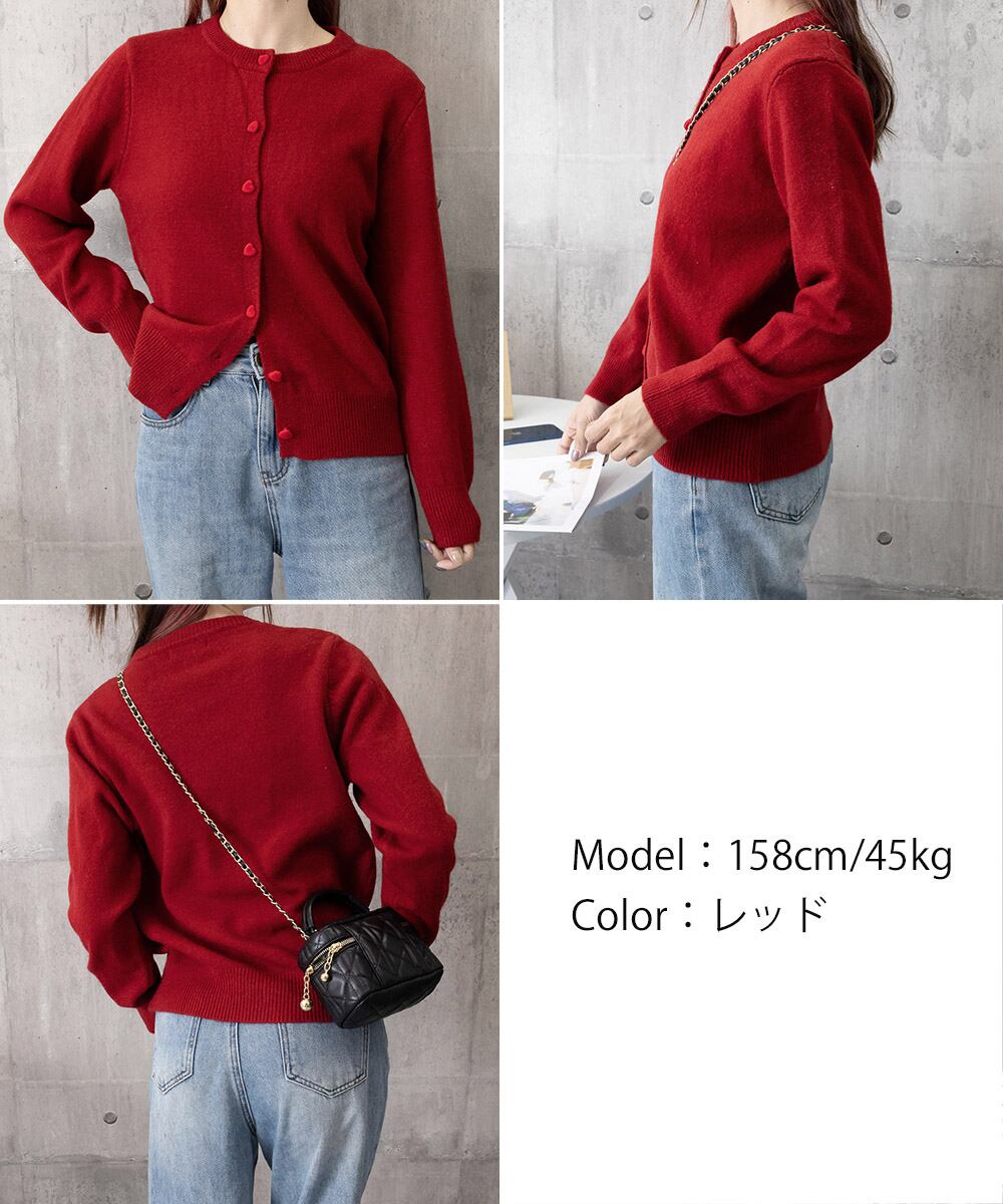 丸首ニット羽織人気 レッドハートボタン 前開きニット 無地
