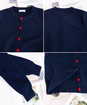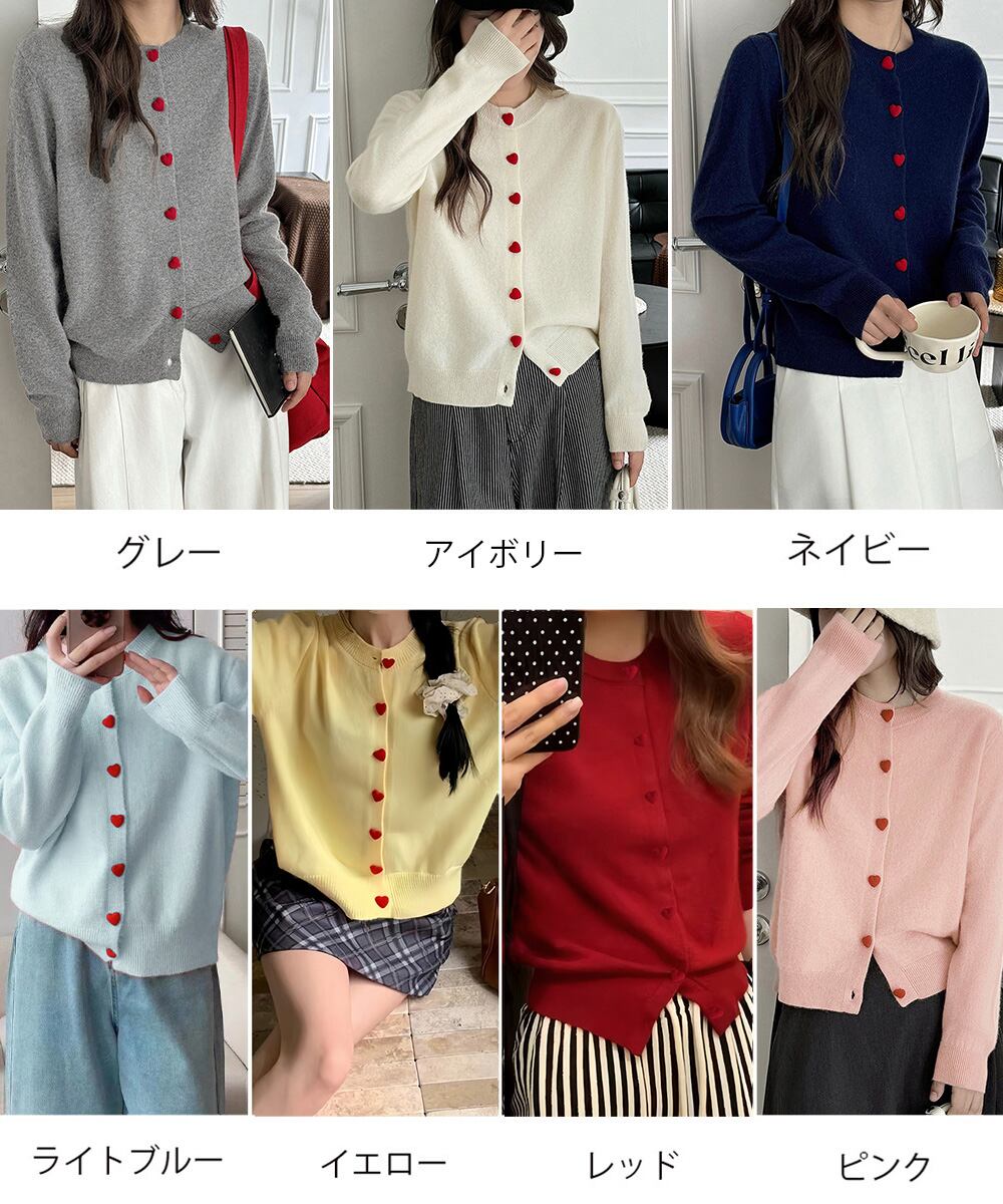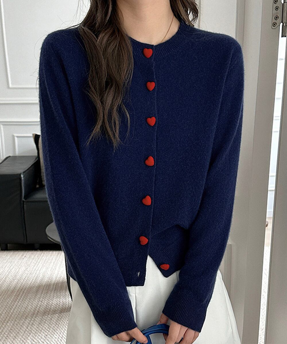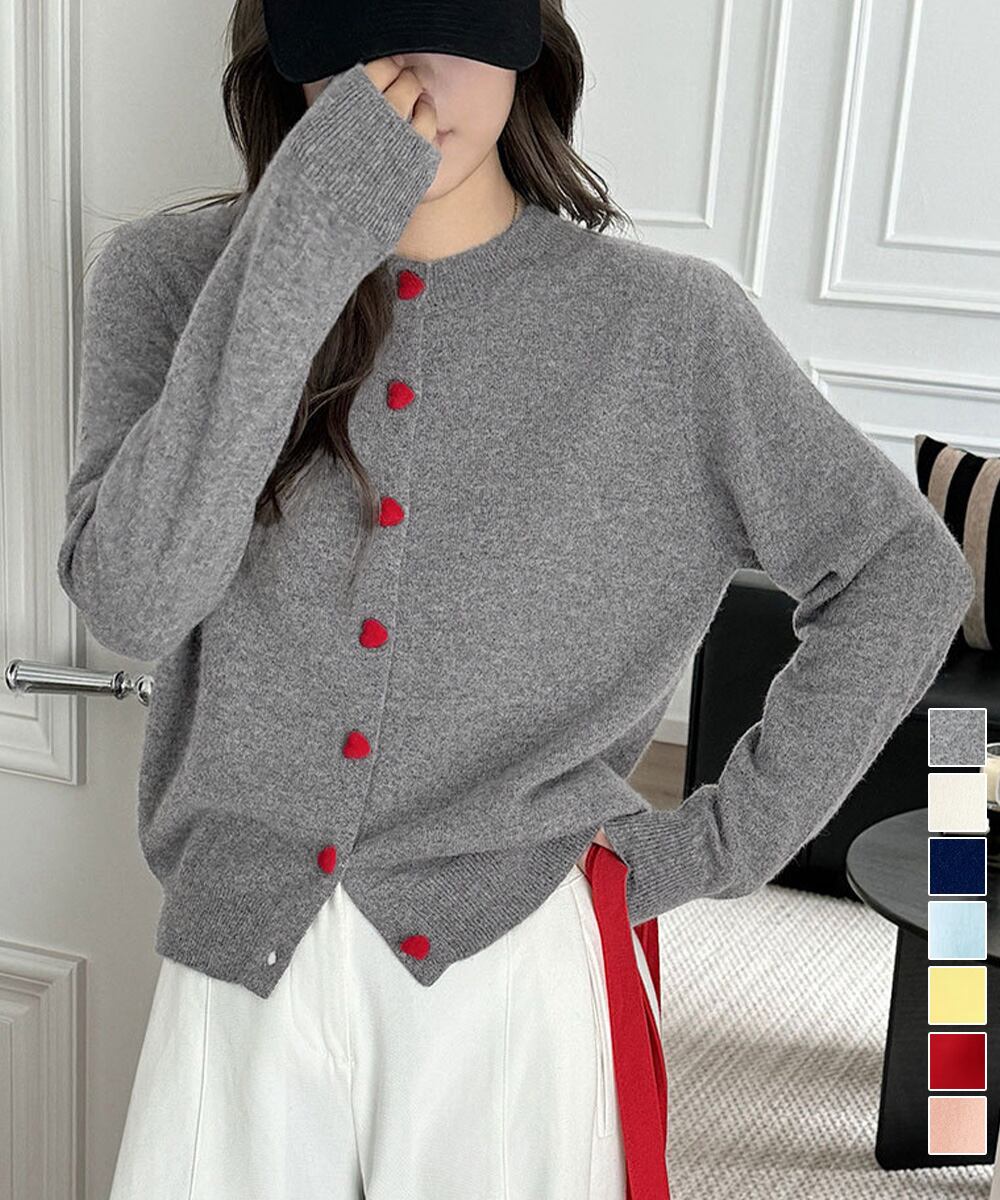 丸首ニット羽織人気 レッドハートボタン 前開きニット 無地
