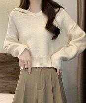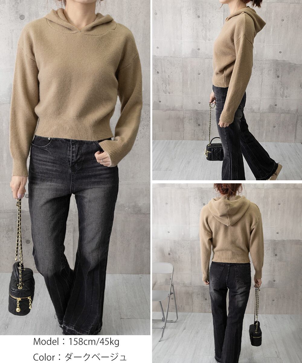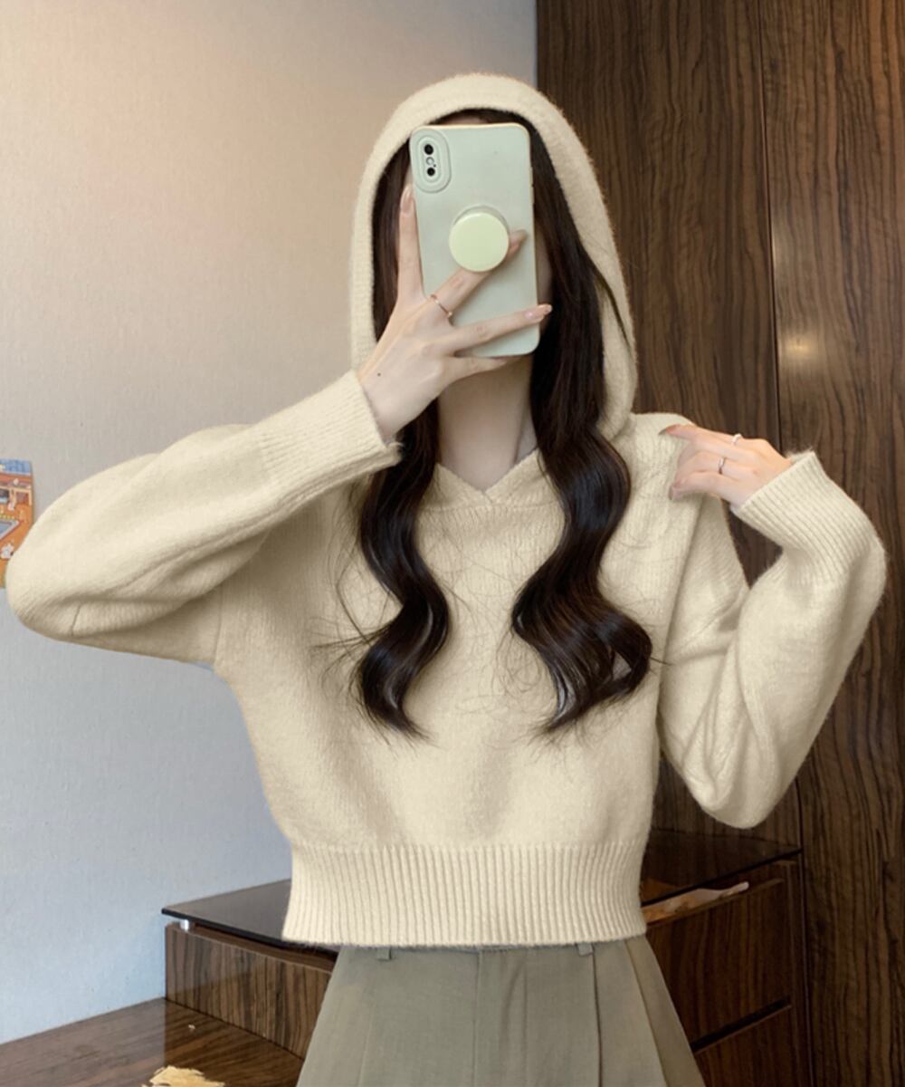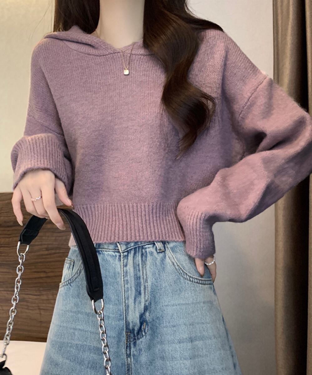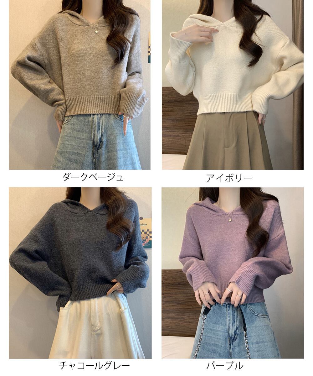 レディース 大人可愛い ショート丈フーディー シンプル ニットプルオーバー おしゃれ 無地セーター 秋冬 ニットトップス