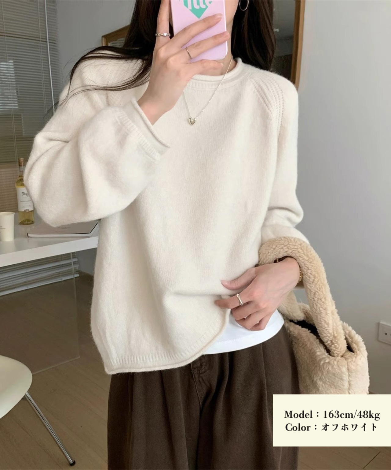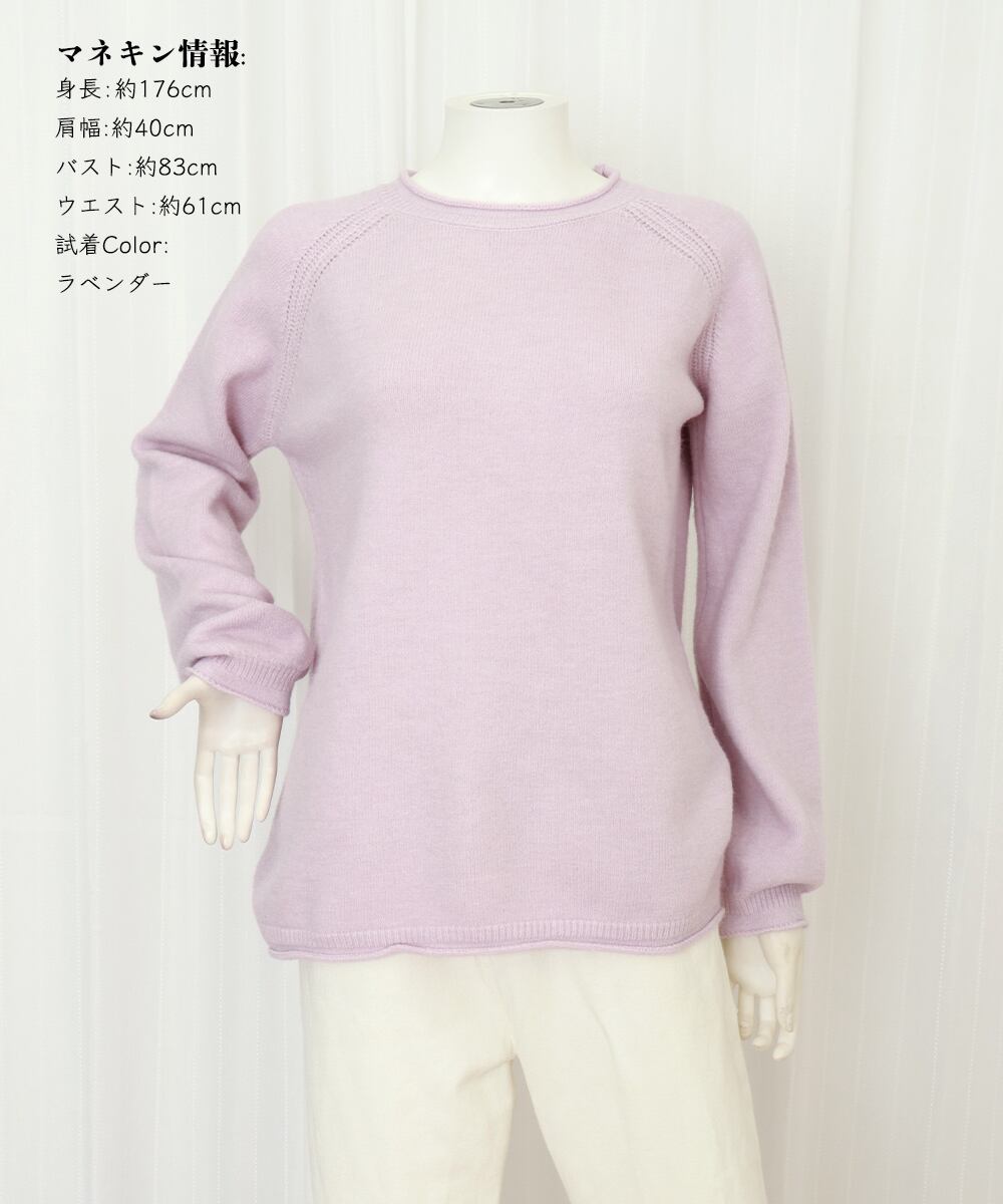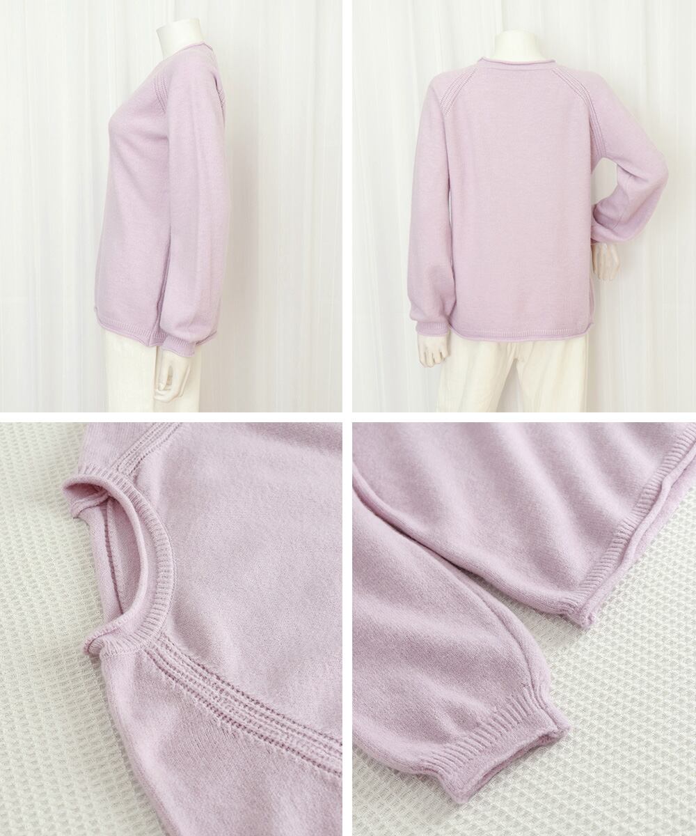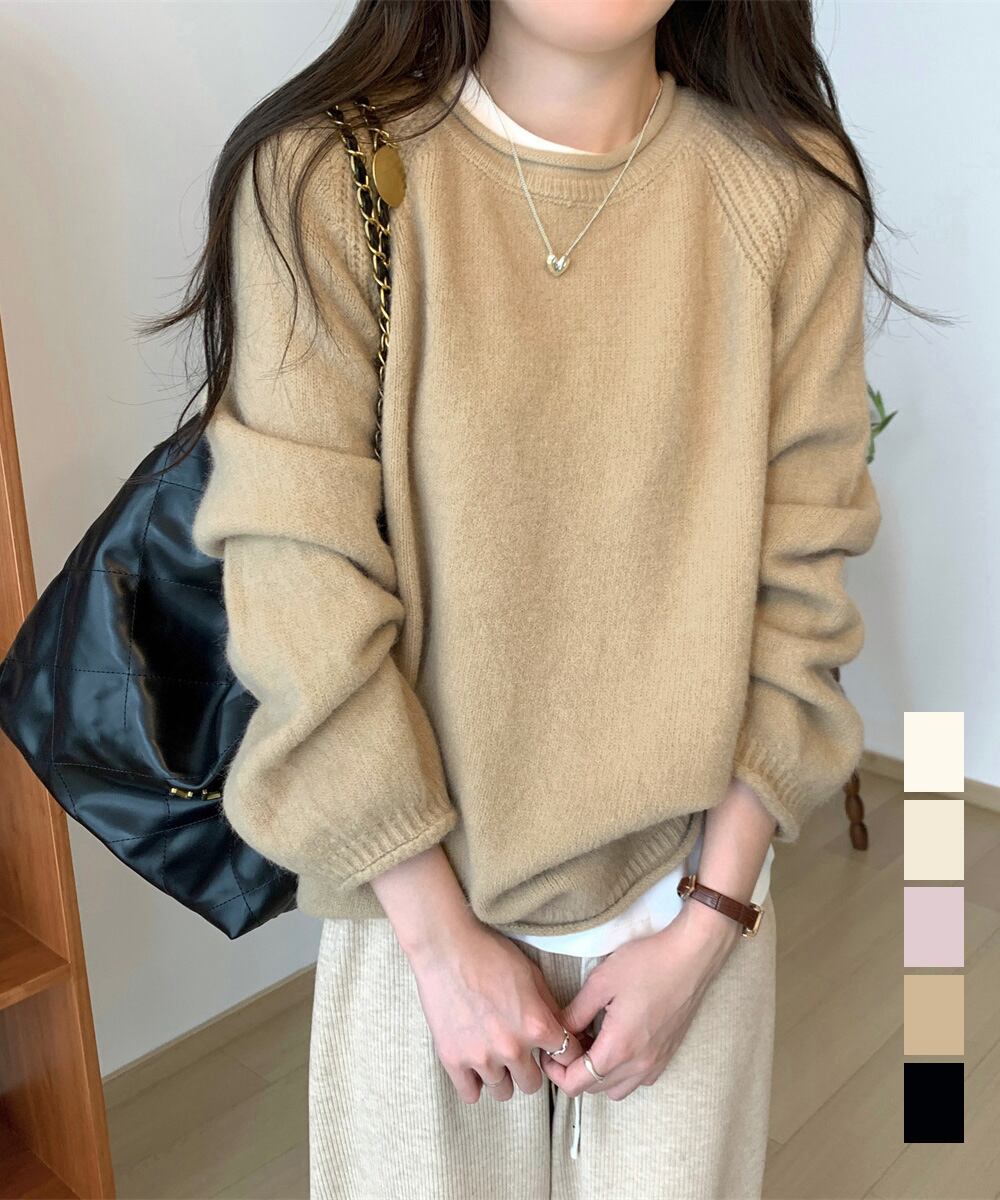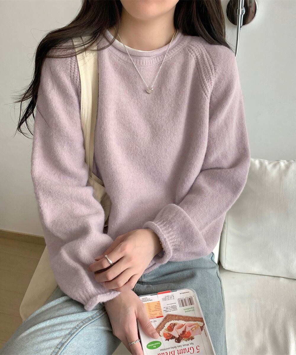 シンプルながら、ラグランスリーブの編み地ディテールがさりげないアクセントに。