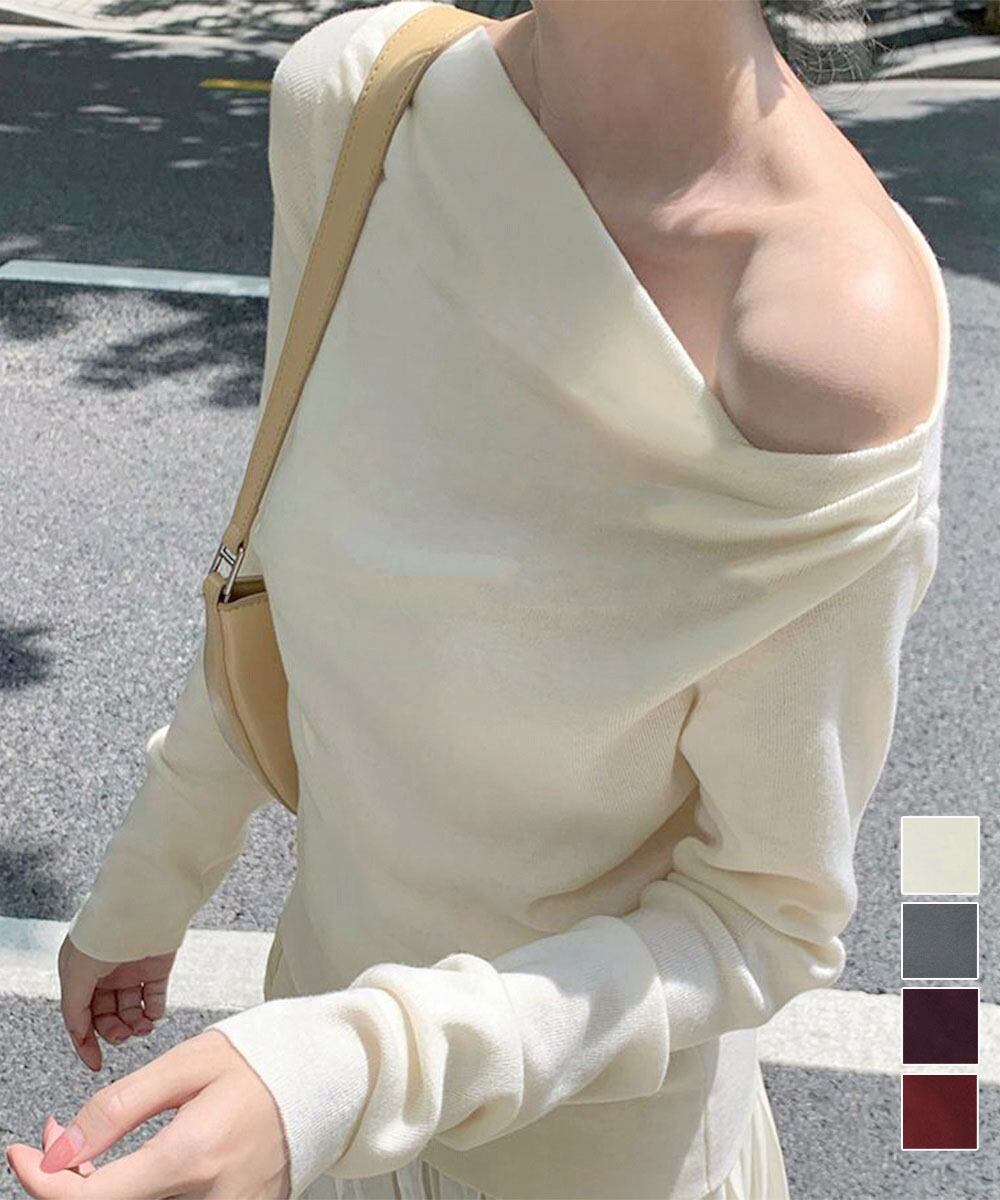 2way ニットソー レディース オフショルダーニットプルオーバー フェミニン 春秋服 ギャザーニットセーターオルチャン