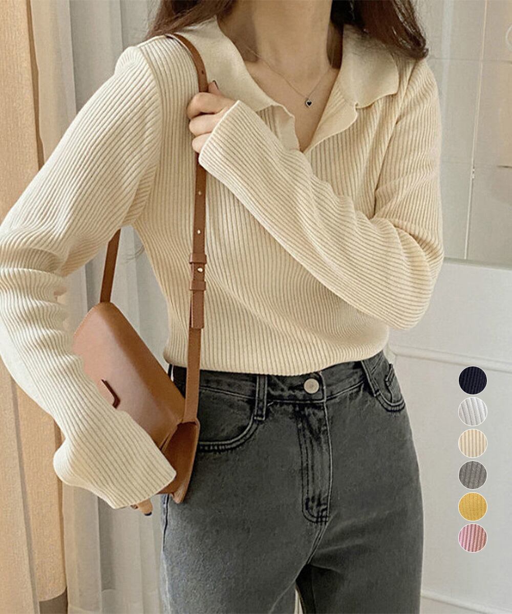 毎日のコーデに取り入れやすい、Vネック×襟付きデザインのベーシックなリブニットトップス。