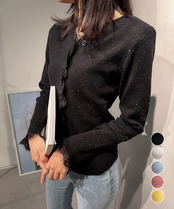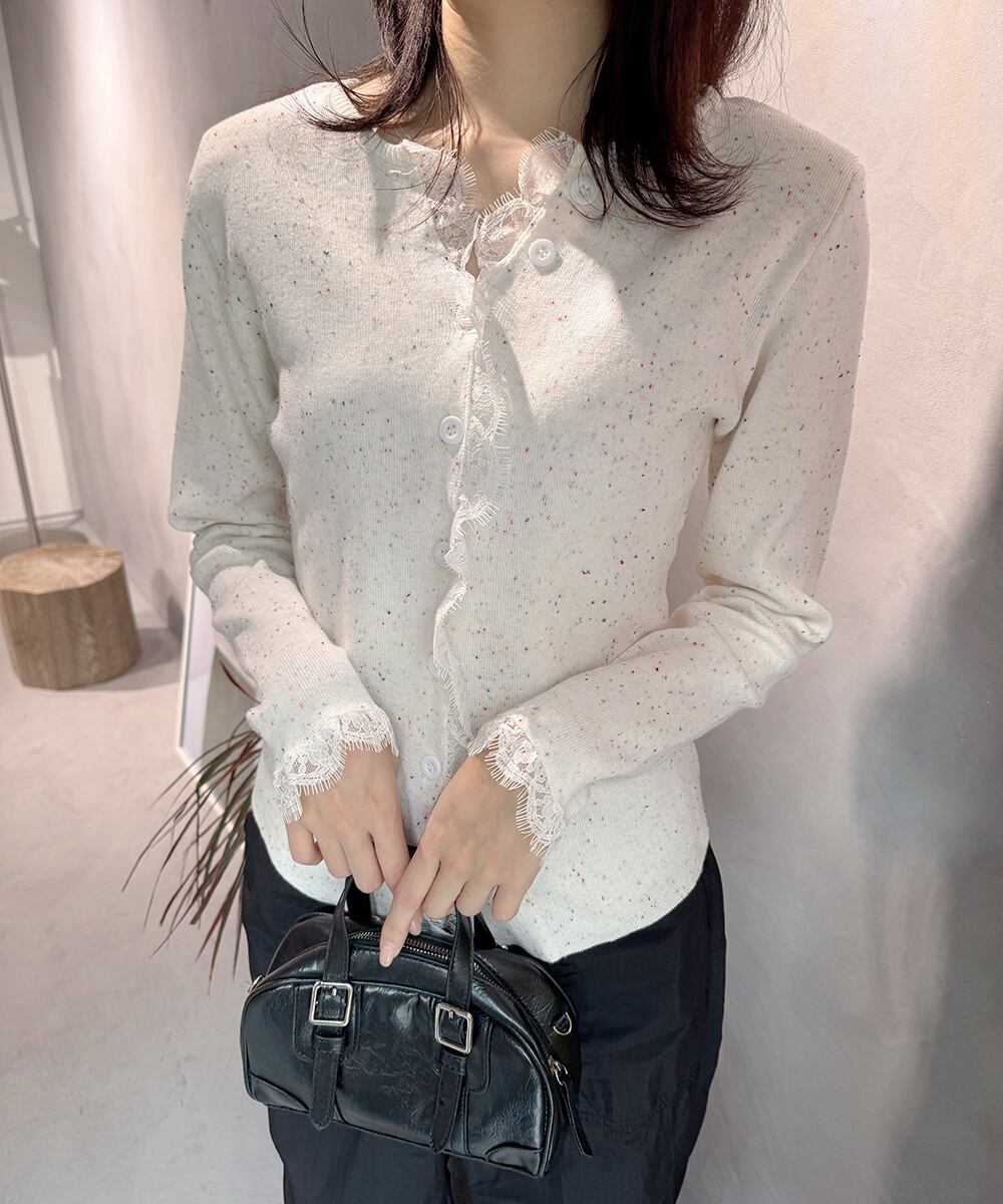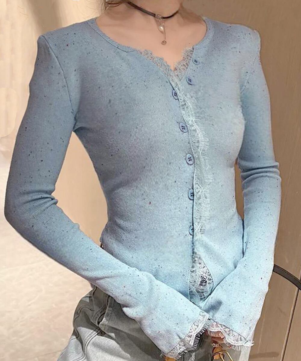 レーストリム付きのVネック長袖ニットカーディガン。
