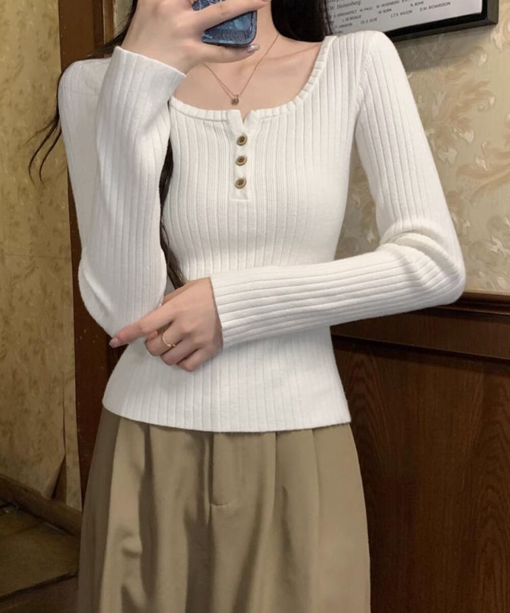 シンプルニットソー 普段着細身トップス リブニットおしゃれ