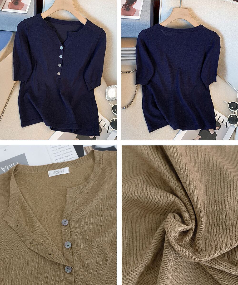 ニットカットソー レディース 無地ハーフボタン 柔らかいプルオーバー 五分袖 通勤服 夏ニット ベーシック 着回し力抜群