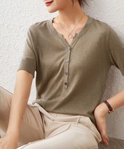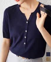すっきりとしたシルエットが魅力のVネック半袖ニットトップス。
