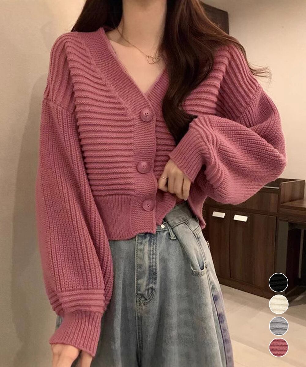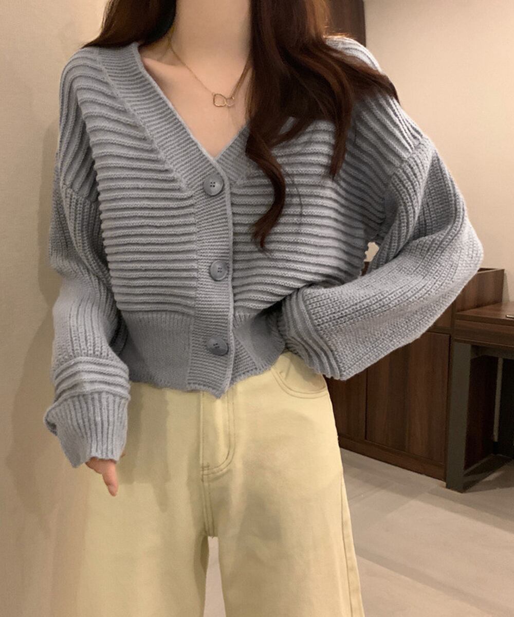 大きめボタンと立体的なリブ編みデザインで、こなれ感を演出。