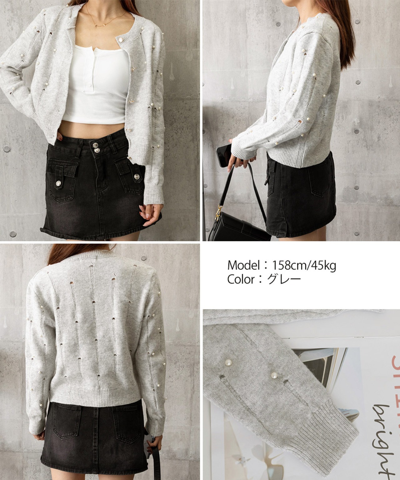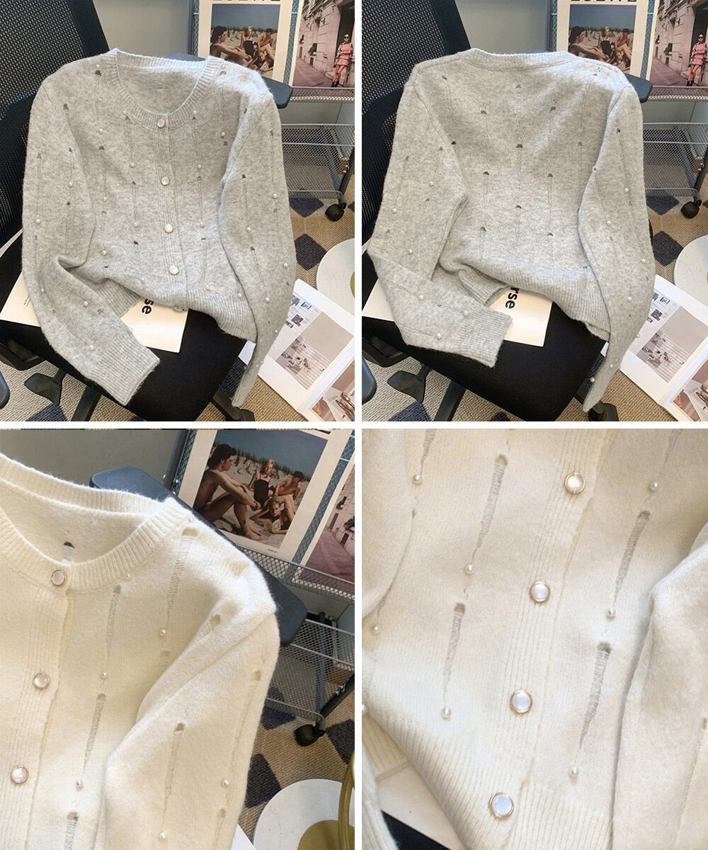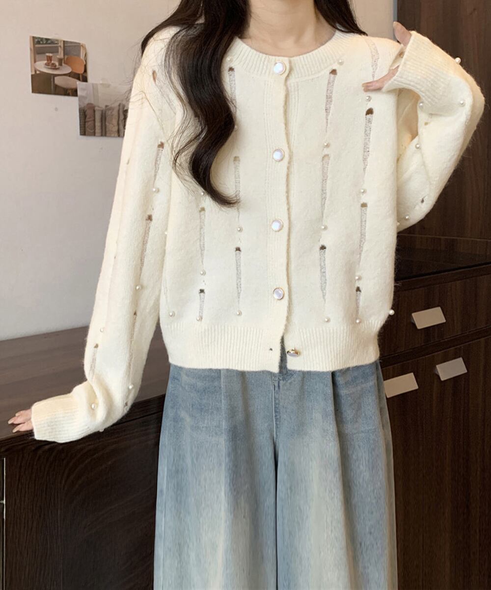 パール装飾がアクセントになったダメージ風ニットカーディガン。