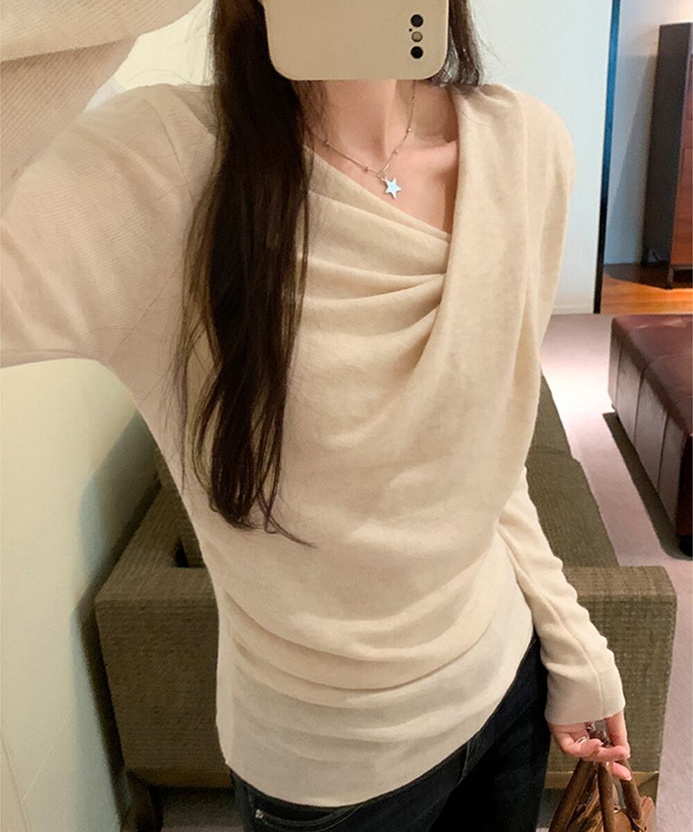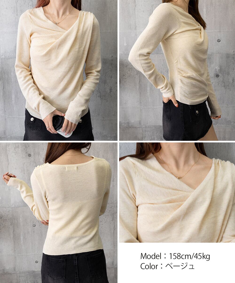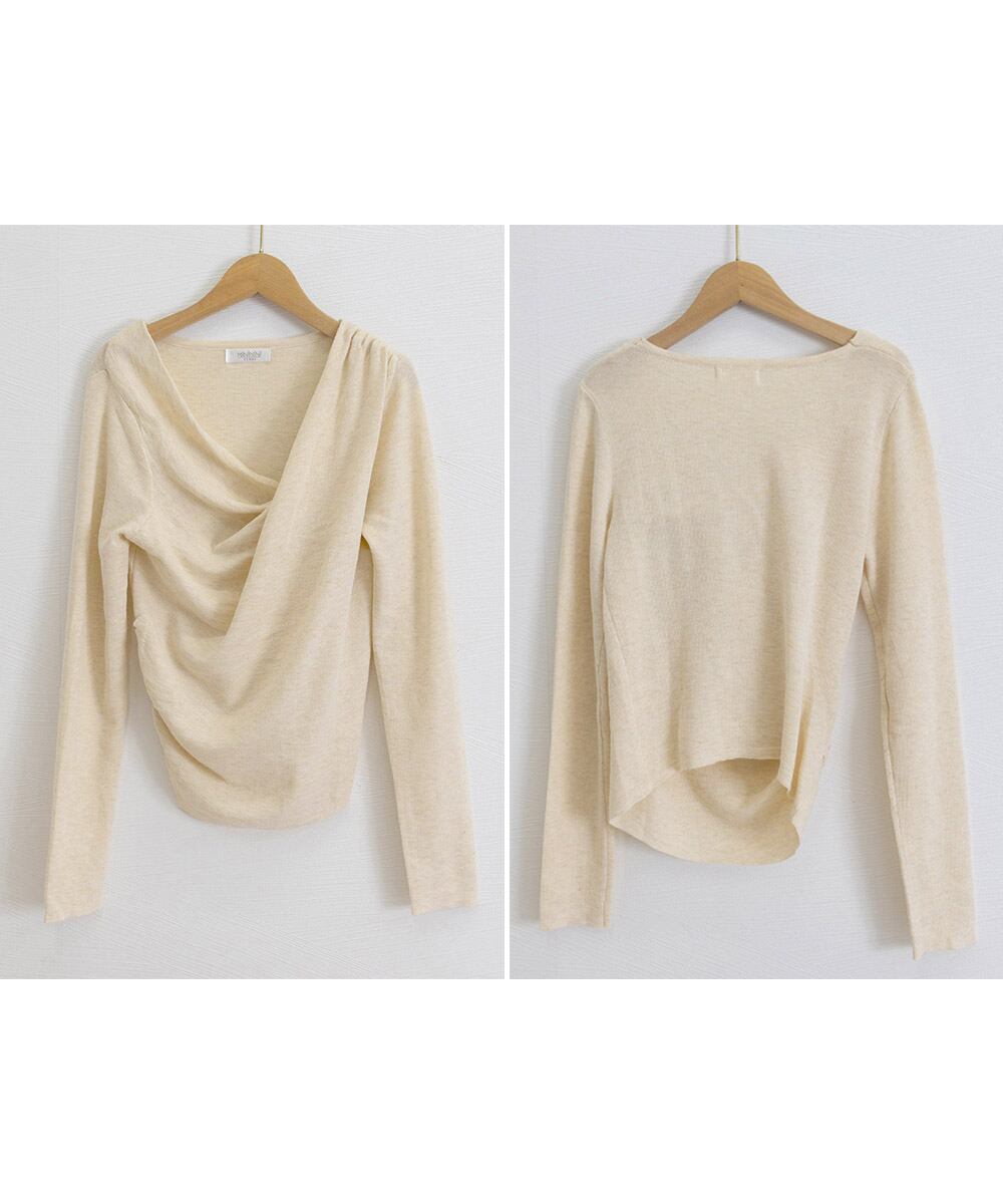 上品なドレープデザインが魅力の長袖ニットトップス。