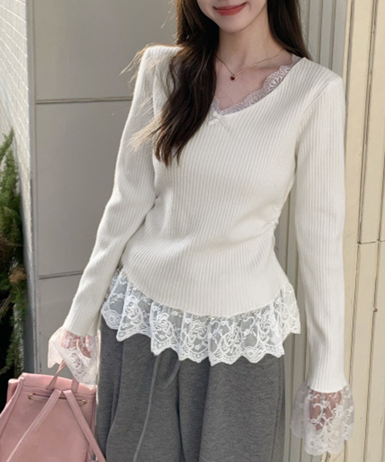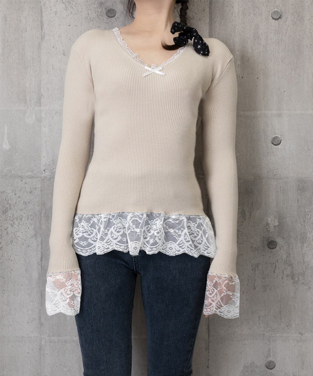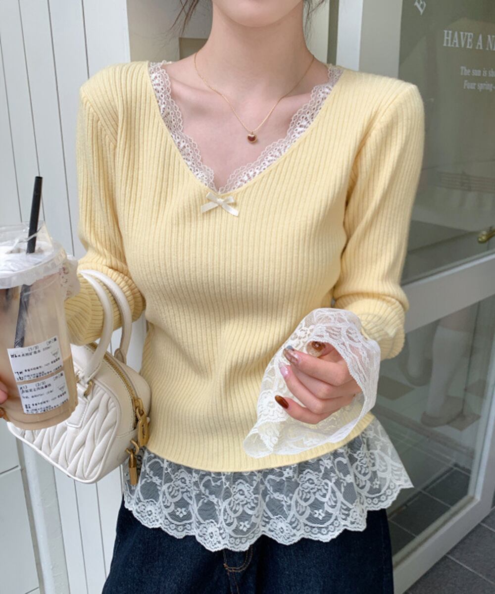 すっきりとしたVネックラインにレースをあしらったフェミニンなニットトップス。