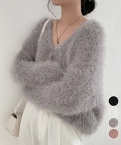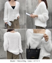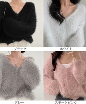 レディース ふわふわニットトップス韓国風 きれいめ 毛足の長い 春秋ニット羽織りゆったり vネックニットぽわん袖 着やせ