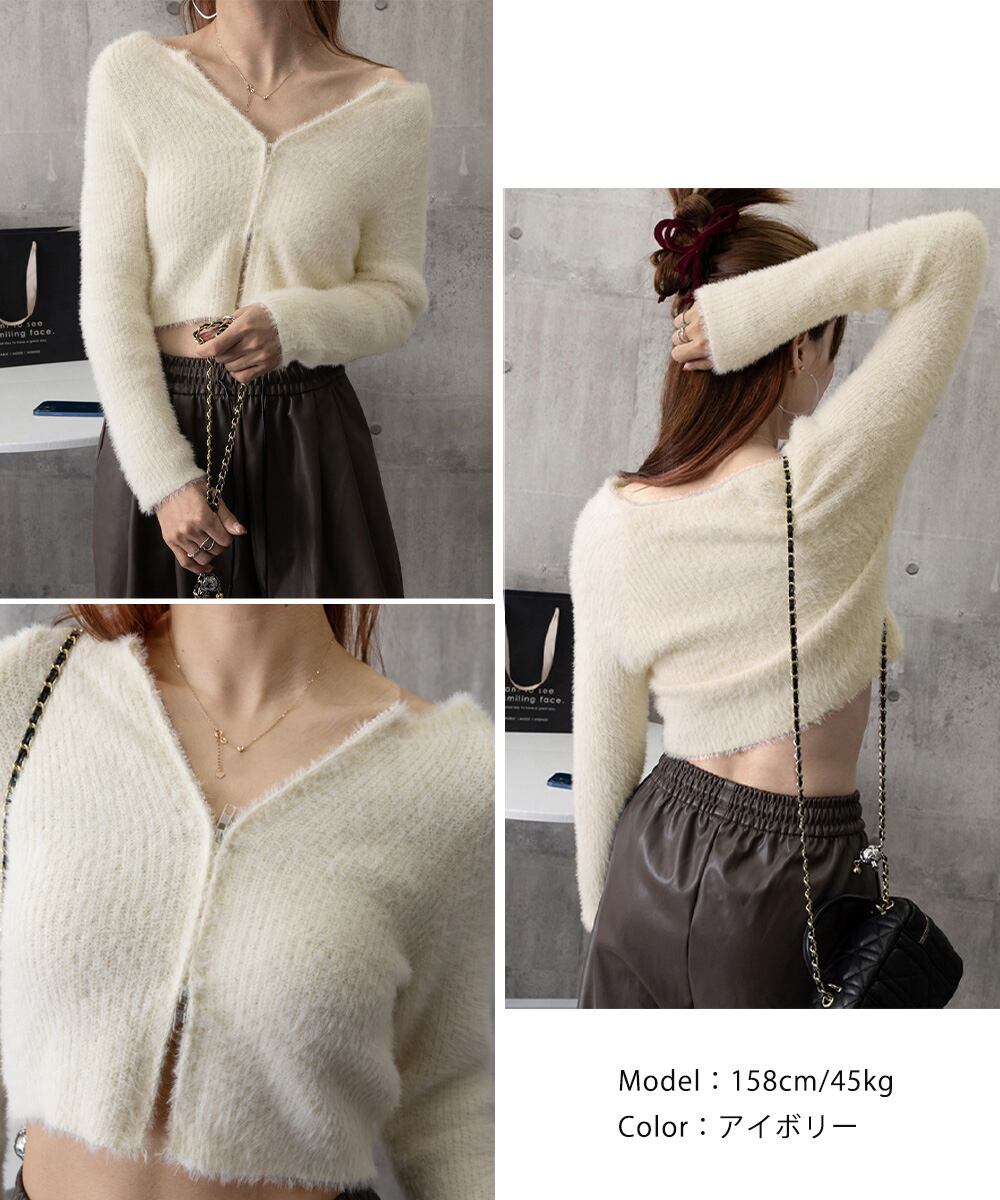 毛足のあるシャギー調ニットを使用したショート丈カーディガン。