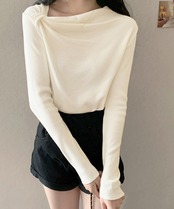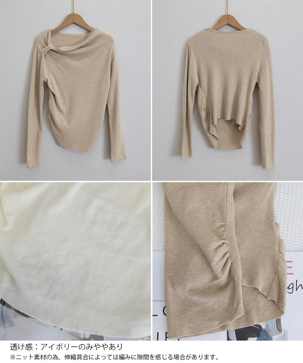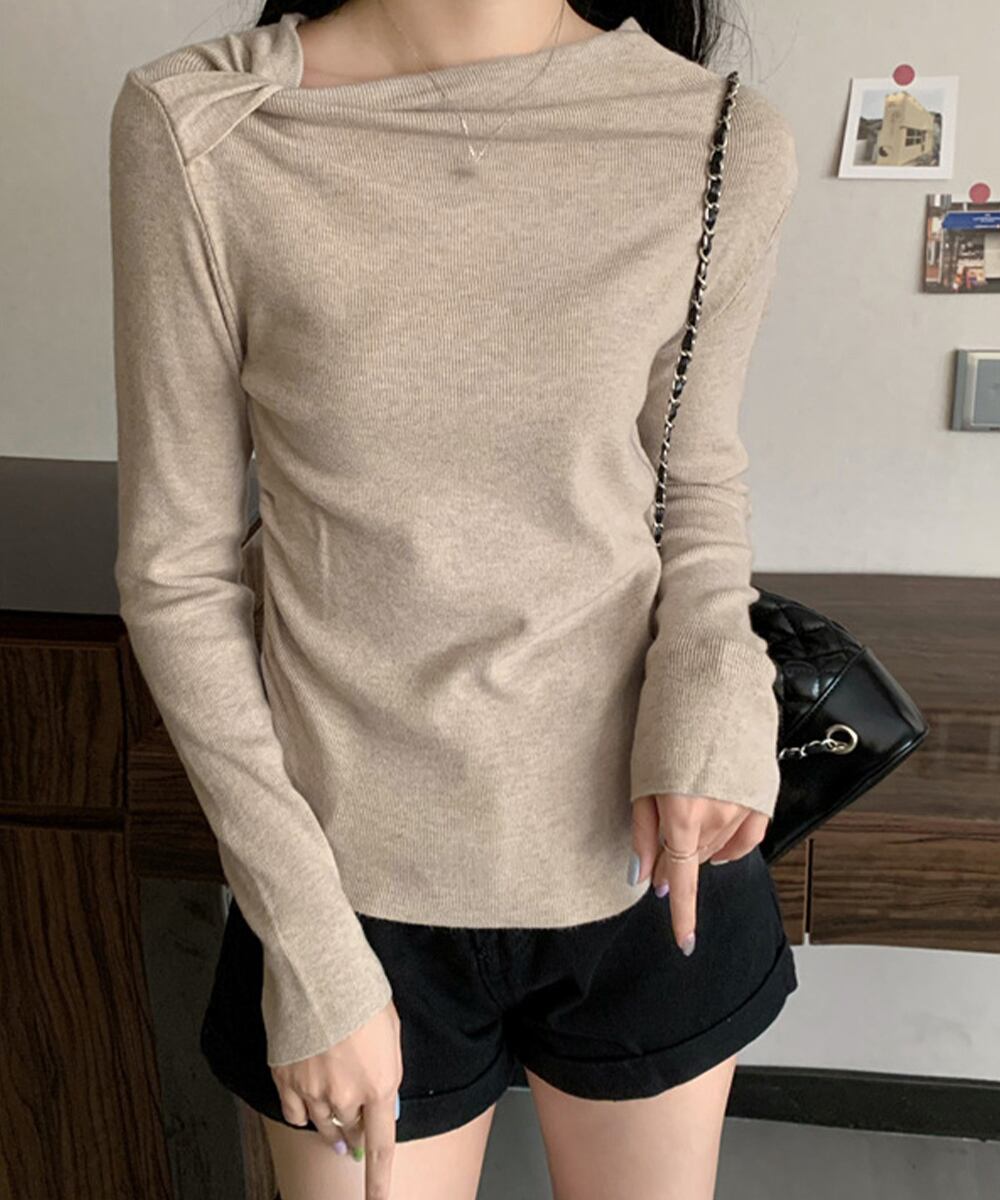 肩に入れたワンポイントのタックと、流れるようなドレープが美しいシルエットを演出するオフショルダーニットトップス。