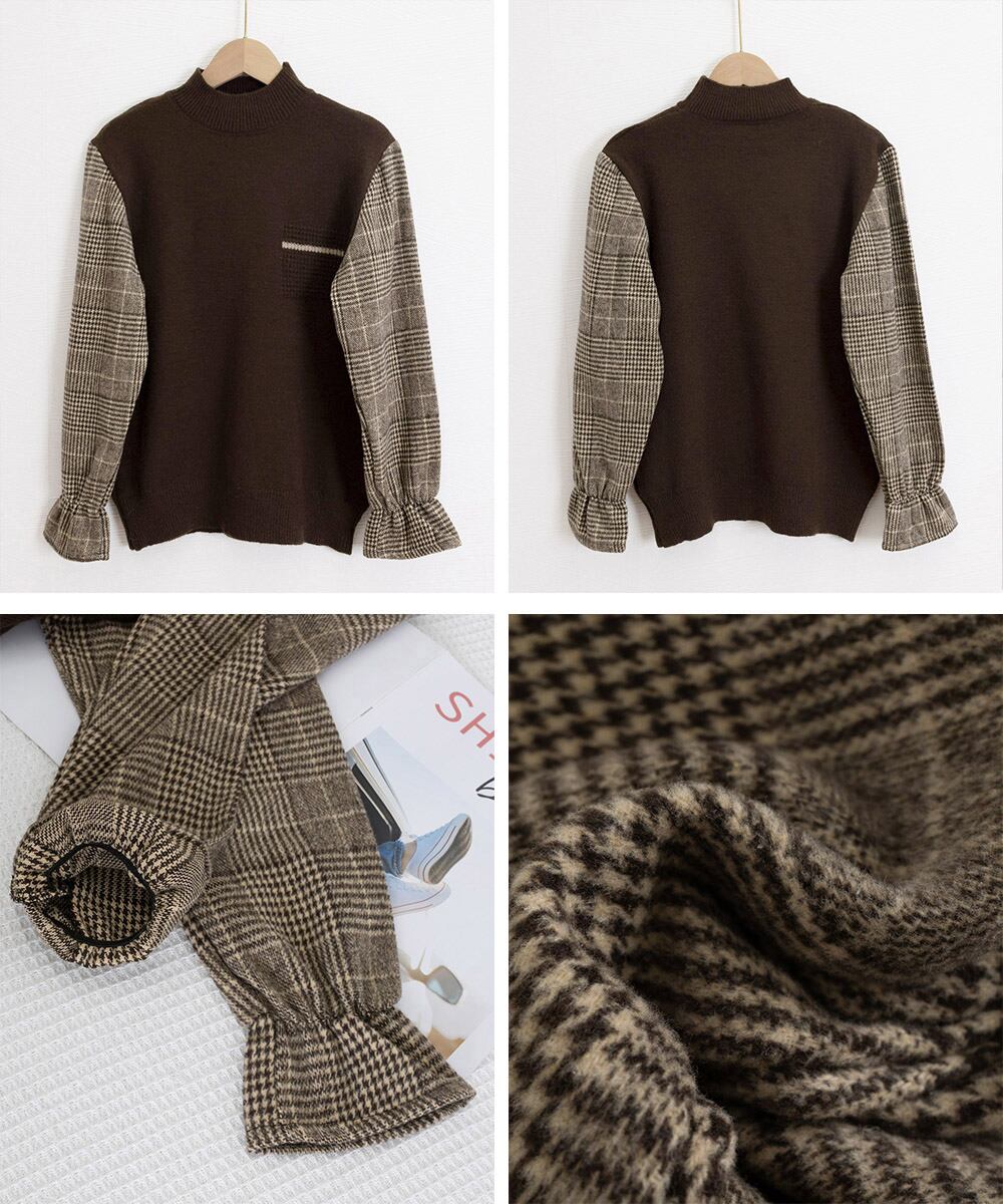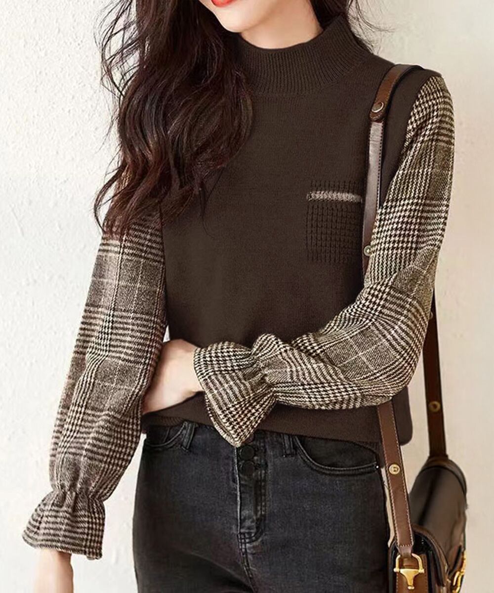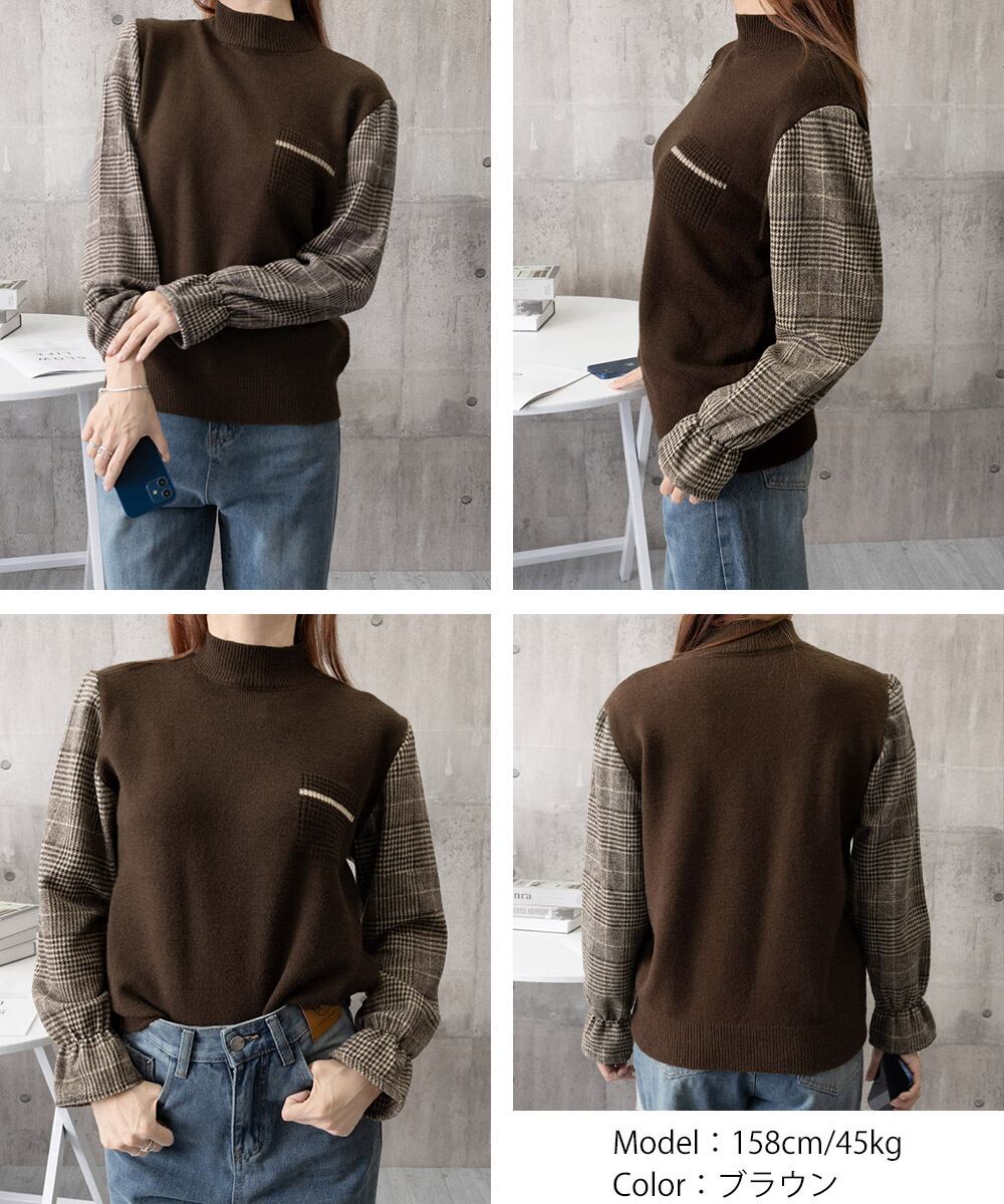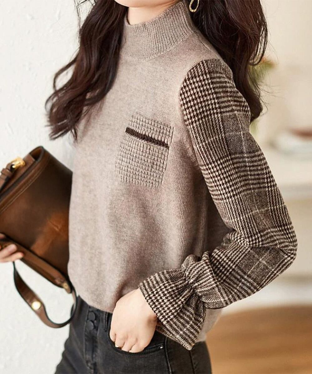 チェック柄の袖が目を引く、異素材ドッキングのハイネックニットトップス。