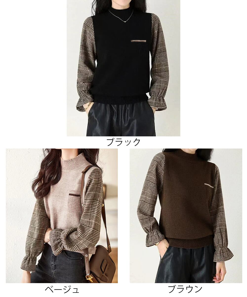 ハイネック 大人カジュアル レイヤード風 ニットトップス 重ね着風ニットプルオーバー袖切り替え 韓国風ニット長袖 着やせ