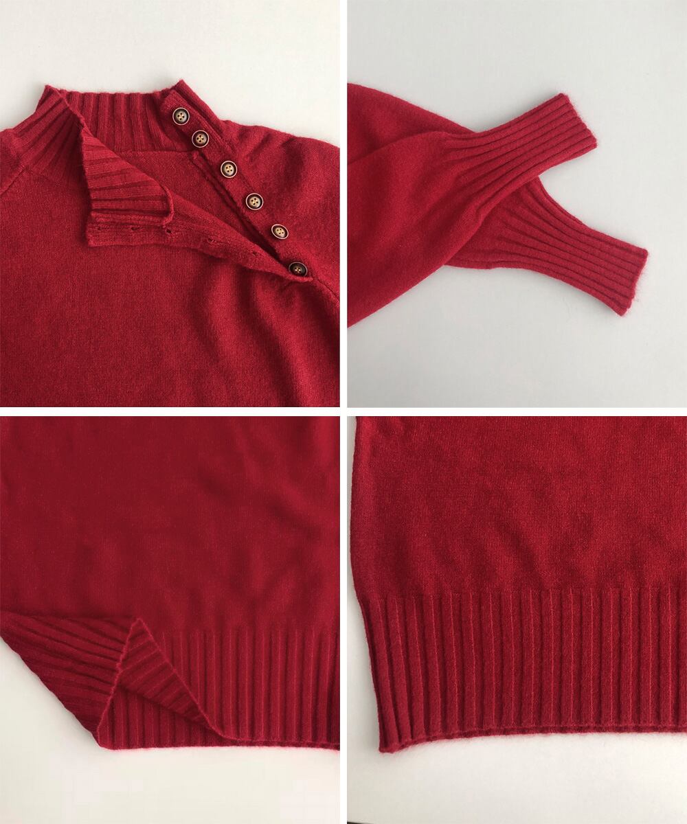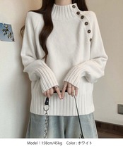 肩から首元にかけて並んだボタンデザインがアクセントになり、シンプルながらも上品な印象を与える。