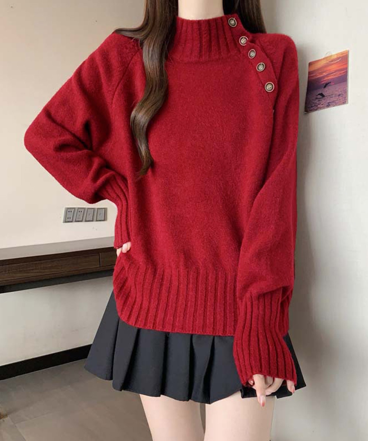 ゆったりとしたシルエットで華奢見えするハイネックニット。