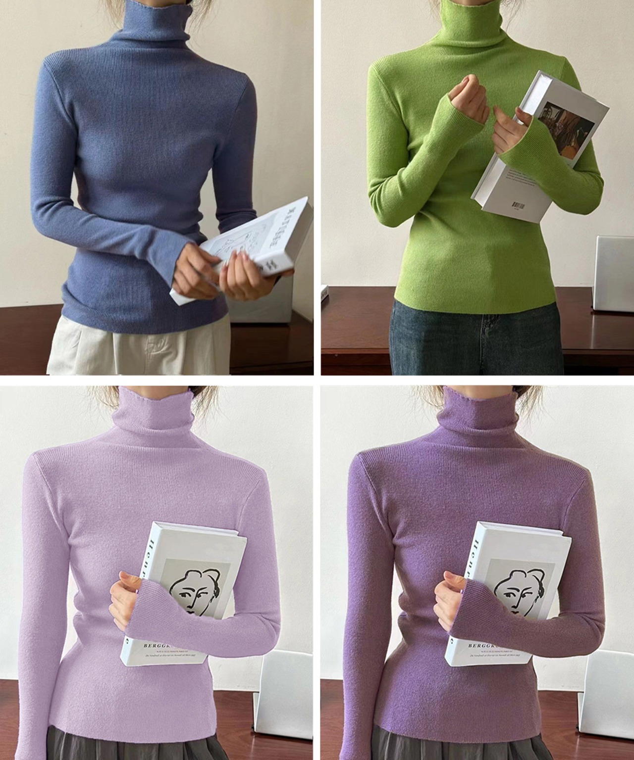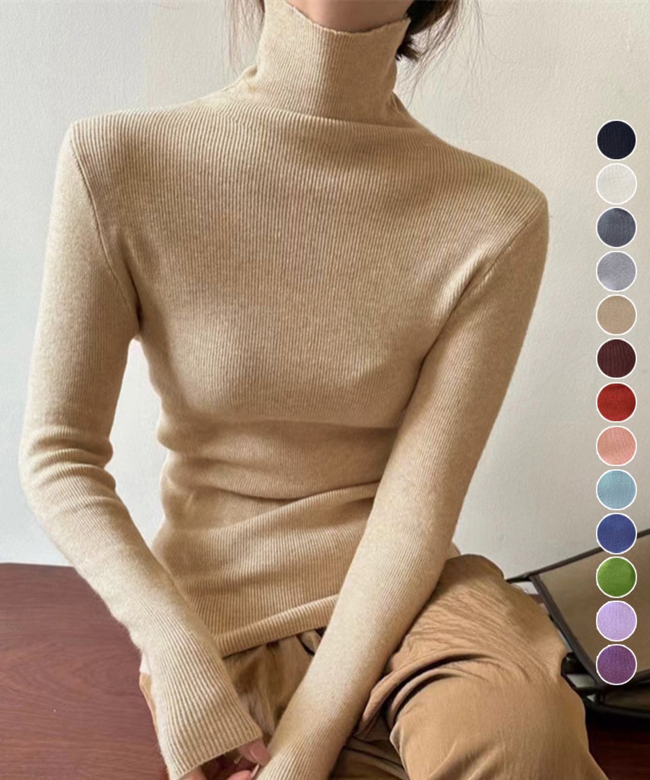 柔らかく滑らかな肌触りが魅力のリブ編みタートルネックニットトップス。