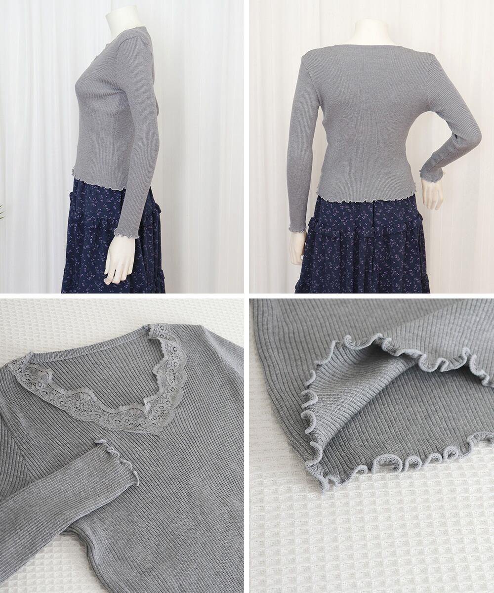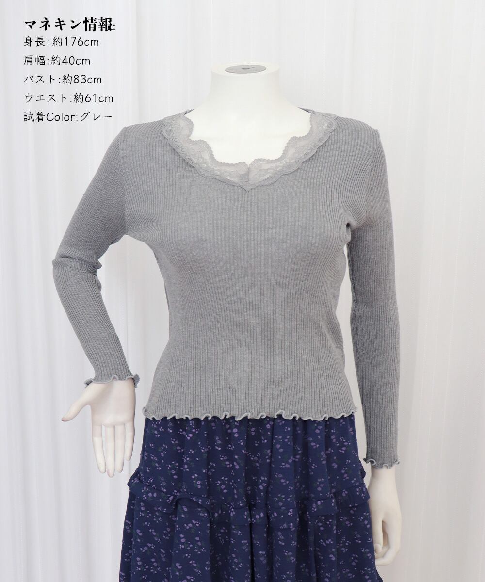 繊細なレースのVネックデザインがデコルテを美しく見せてくれる。