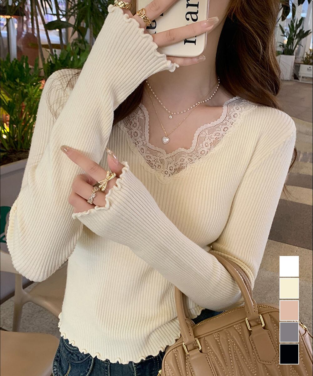 ニットソー 無地ニット ニットセーター ニットインナー Vネック フリル 柔らかい 着回し カジュアル 大人 可愛い
