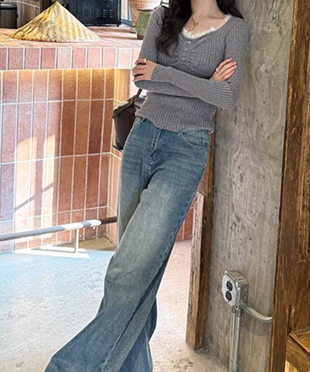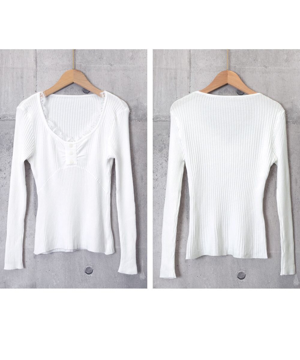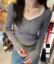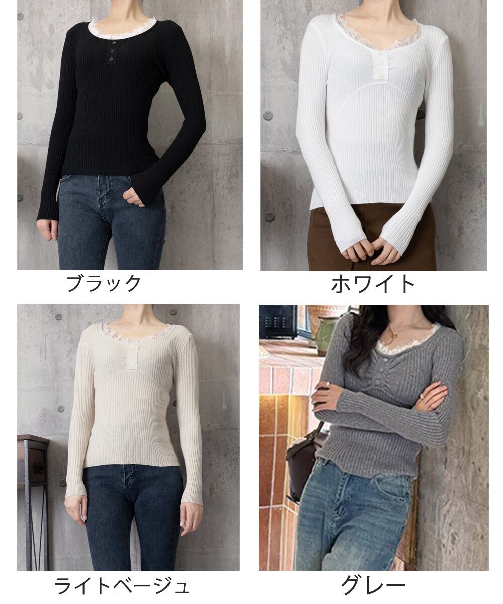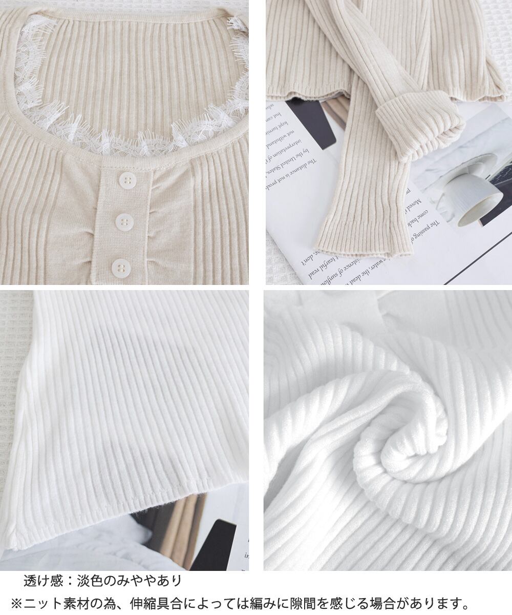 ニットトップス レースネック 長袖 秋冬