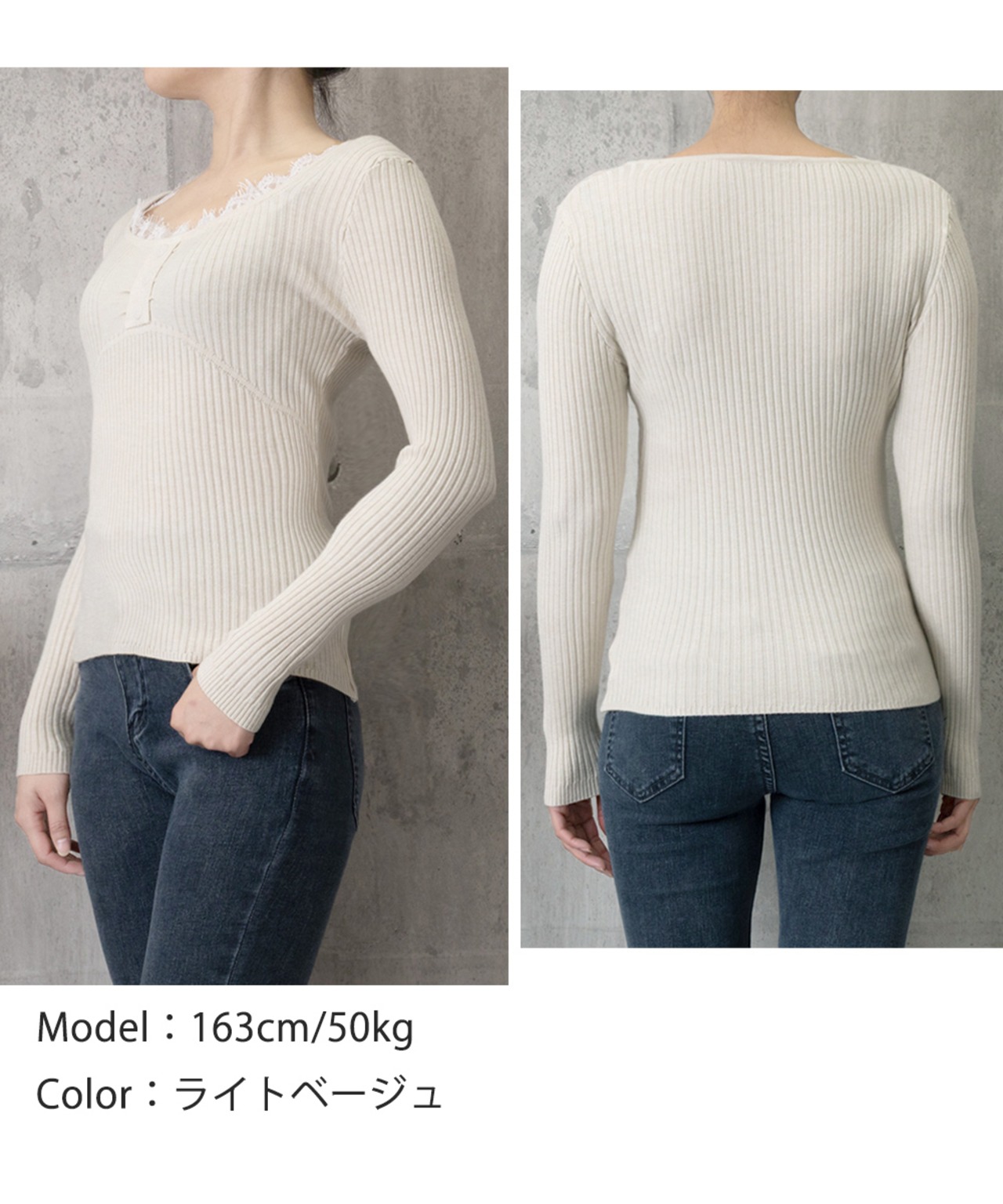 繊細なレースネックが女性らしいフェミニンな雰囲気をプラス。