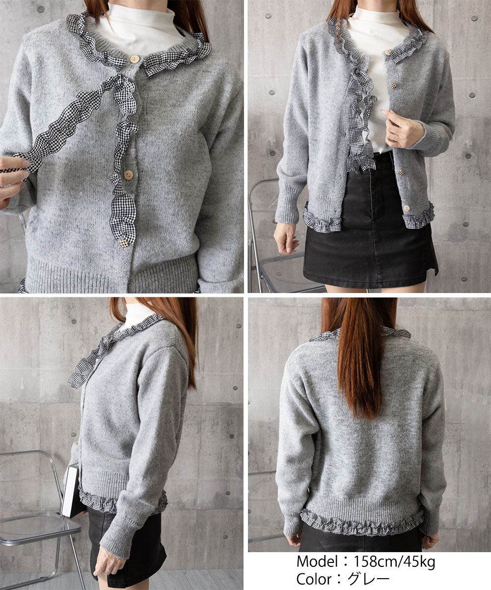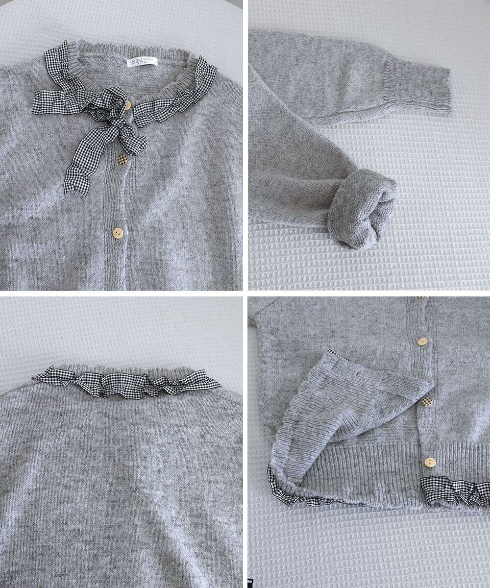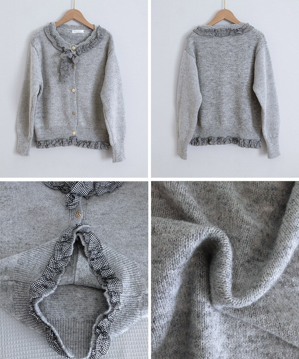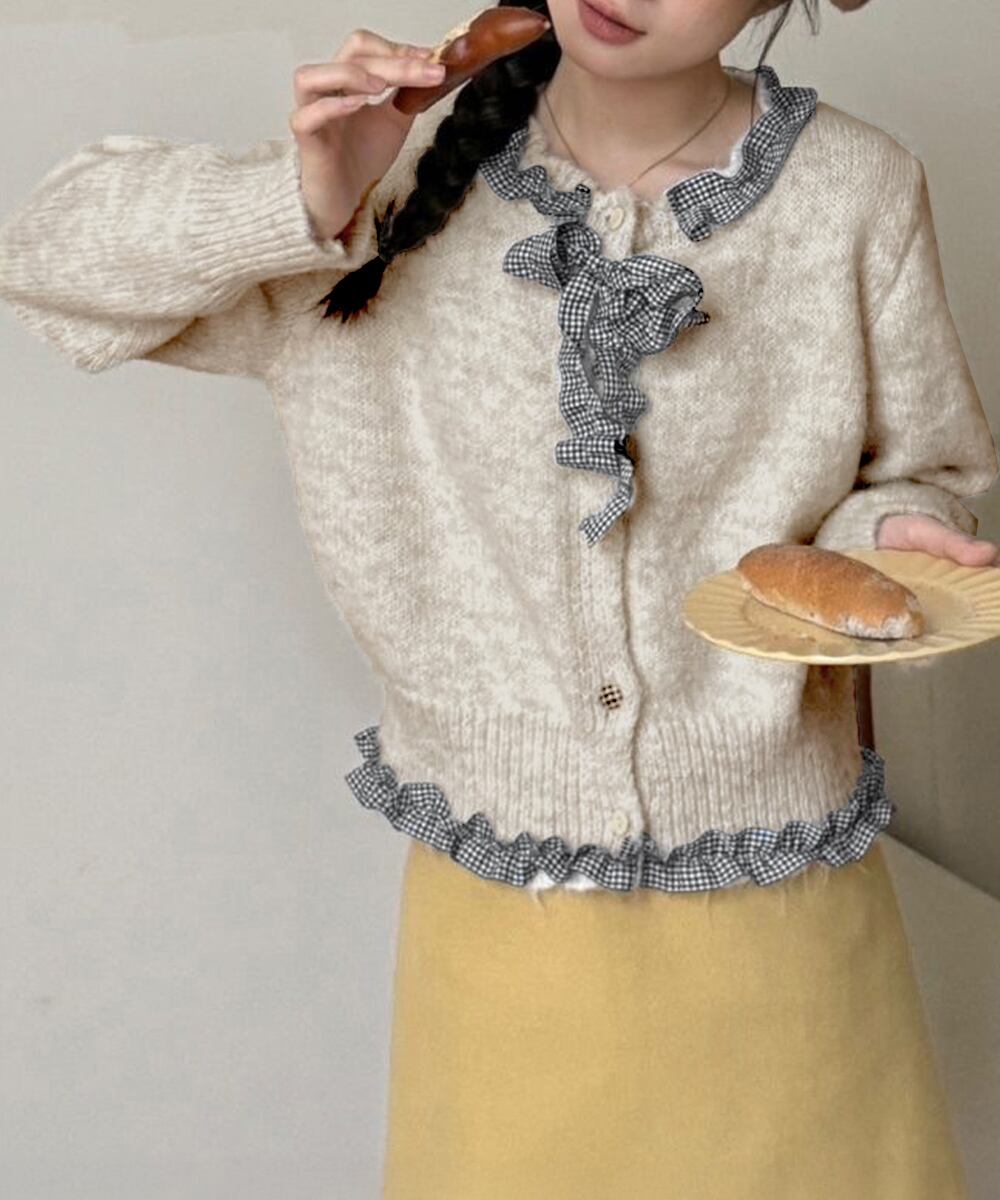 ガーリーテイストの異素材フリルに、ギンガムチェックのリボンを添えたラウンドネックニットカーディガン。