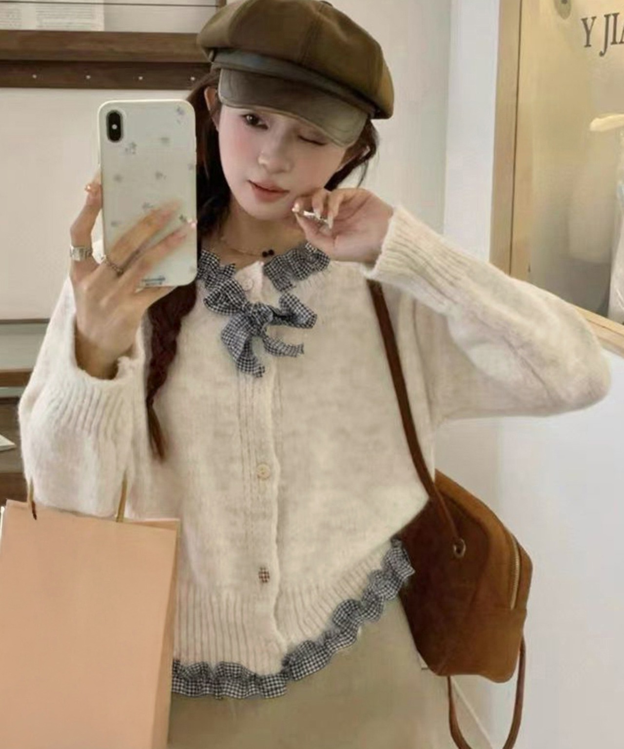 レディースギンガムチェックリボン 切り替えニットトップス きれいめフリル裾カーディガン おしゃれ 大人可愛いニット韓国風