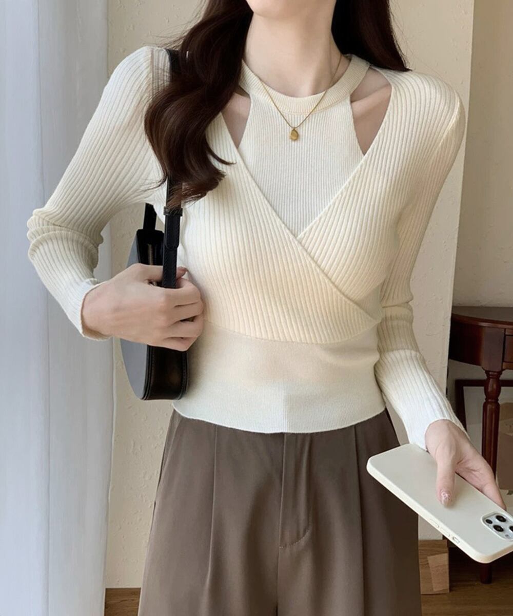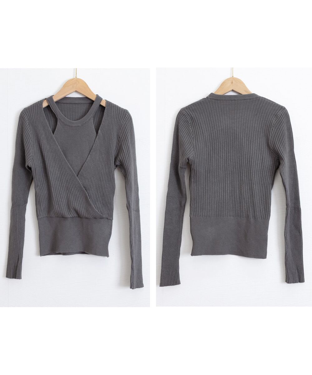 重ね着風のクロスデザインが目を引くリブニットトップス。