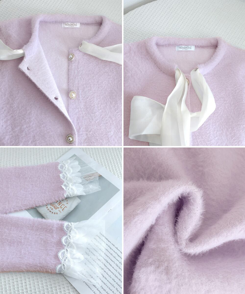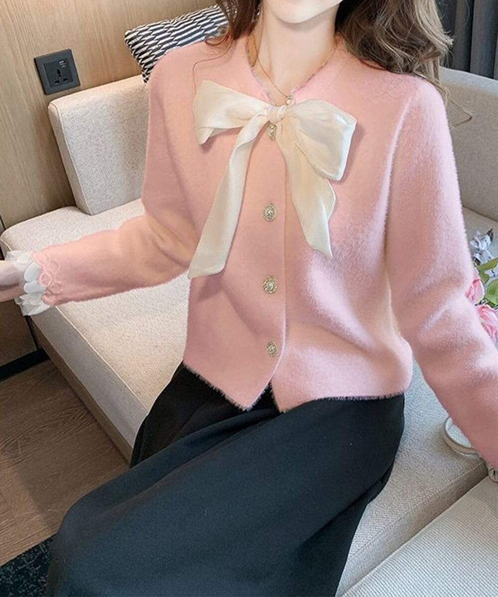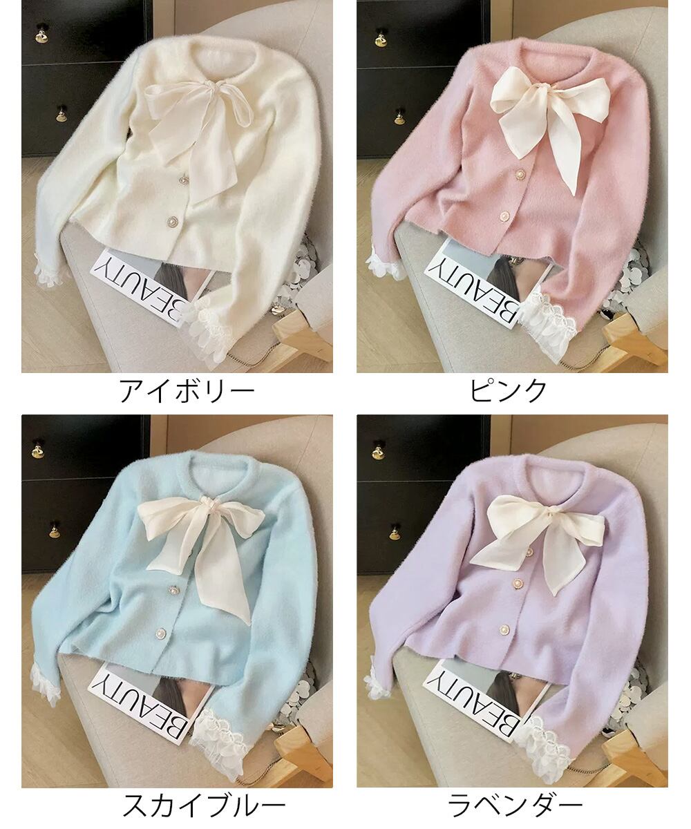 大人可愛いニットセーター 袖レース レディース オフィスカジュアル ビッグリボンニットカーディガン パール調ボタン韓国風