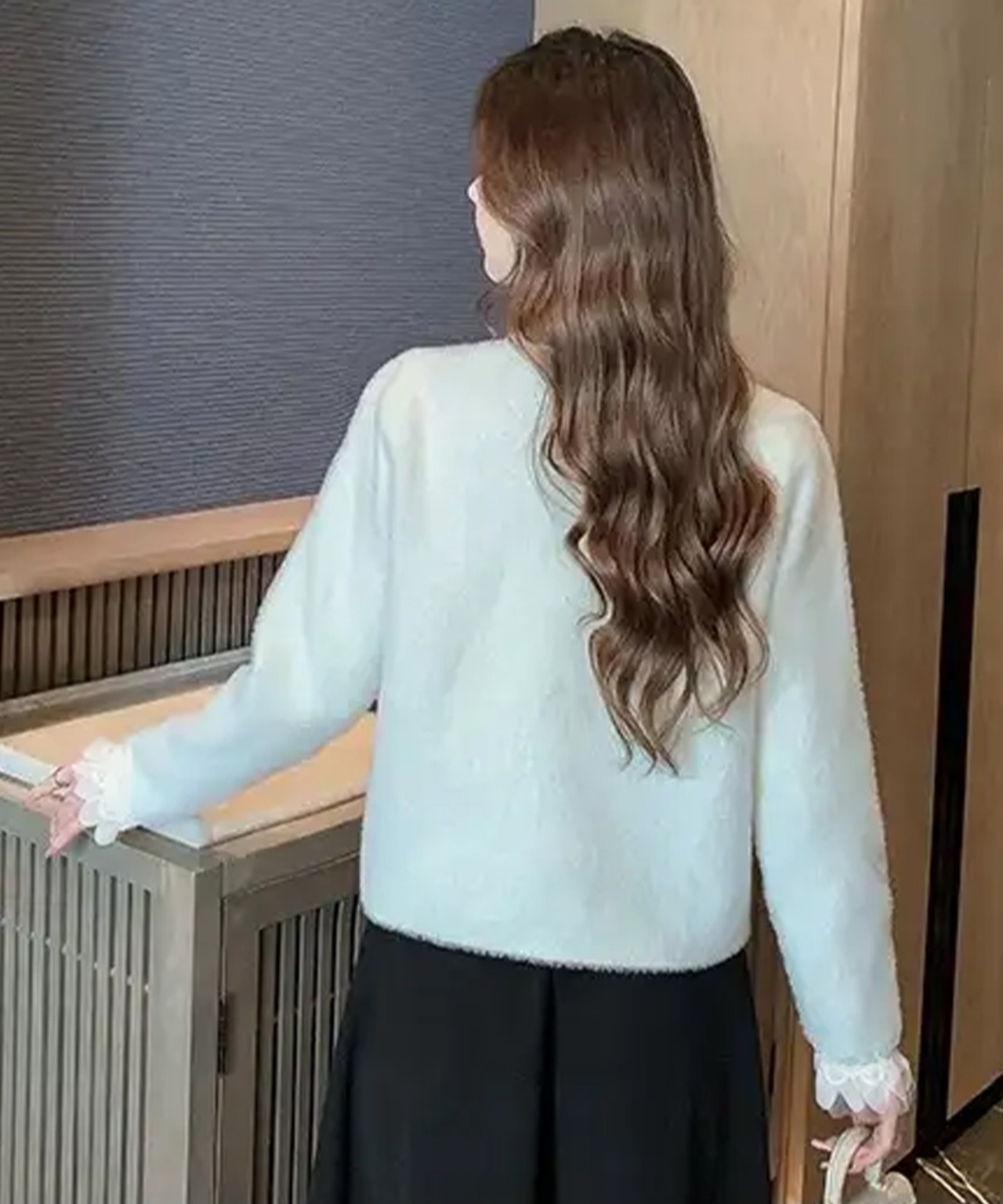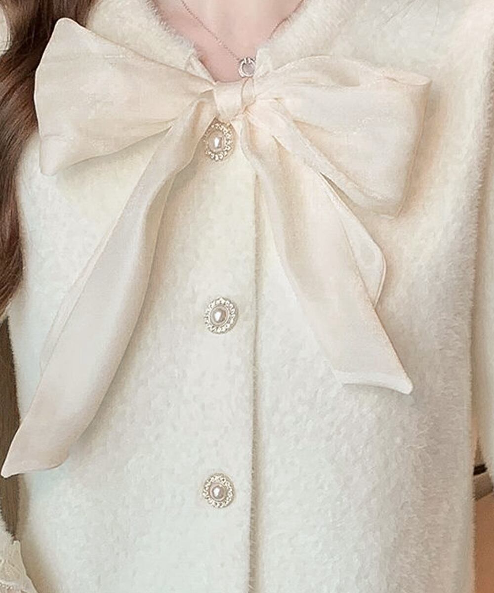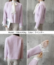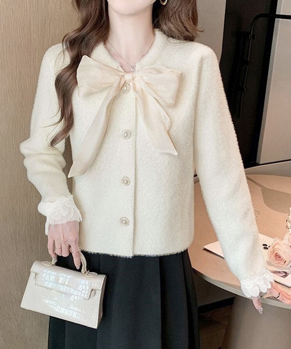 大人可愛いニットセーター 袖レース レディース オフィスカジュアル ビッグリボンニットカーディガン パール調ボタン韓国風