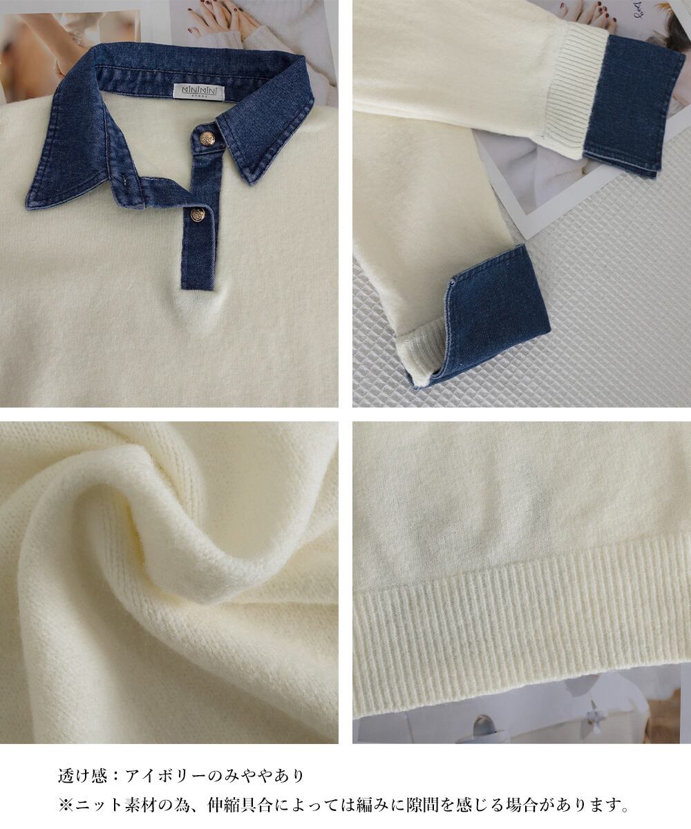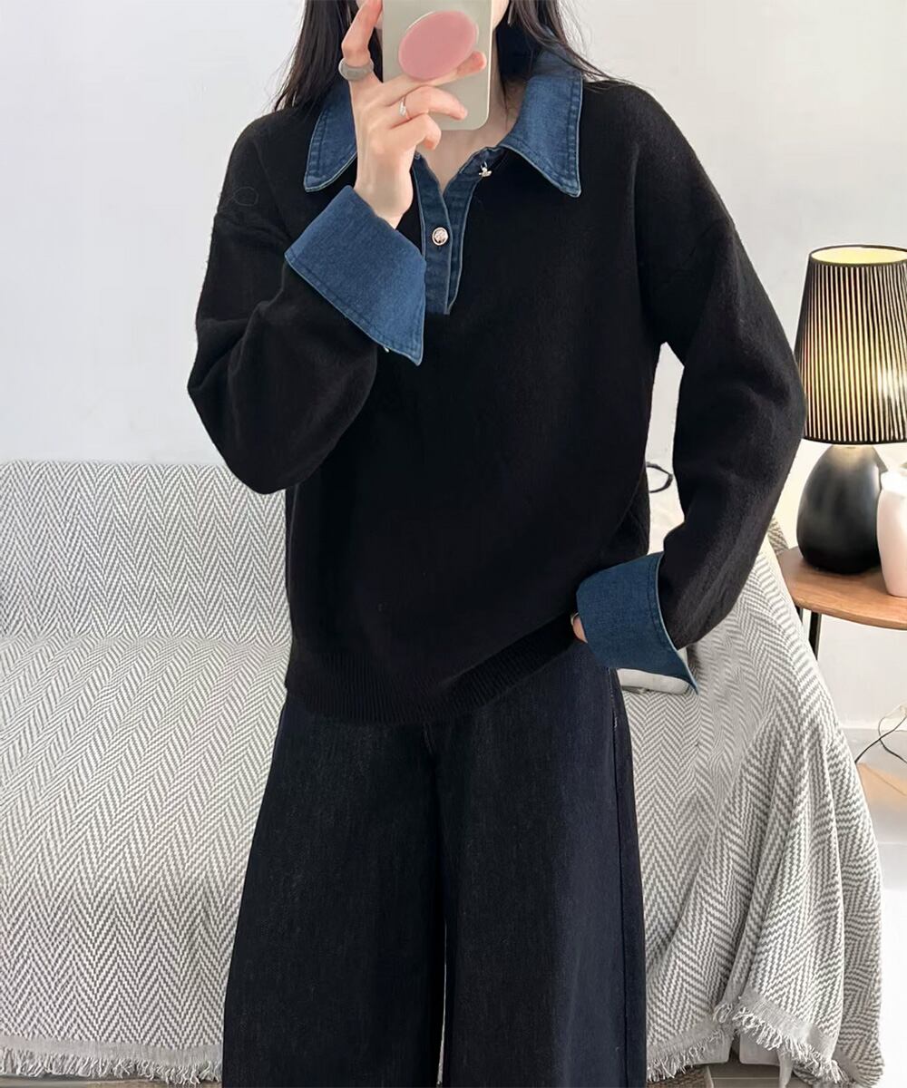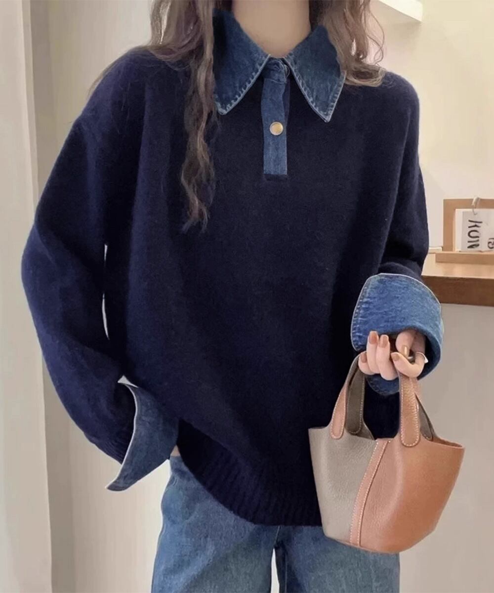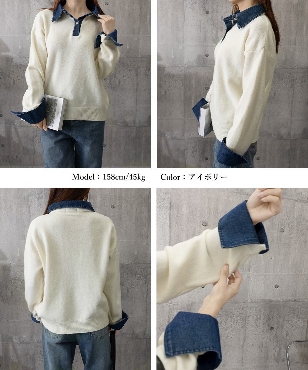 異素材ドッキングニットトップス 重ね着風 デニム衿ニットプルオーバー レディース おしゃれ 大人カジュアルニット 着やせ