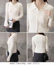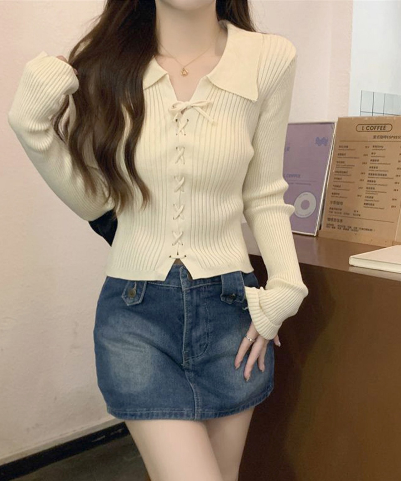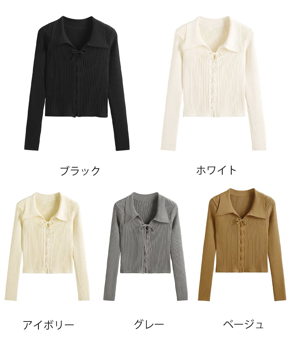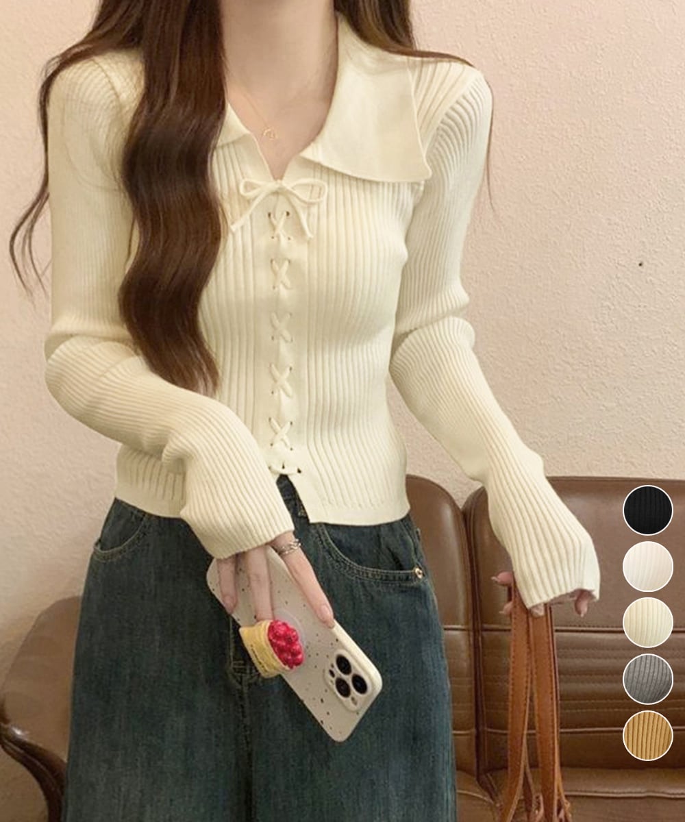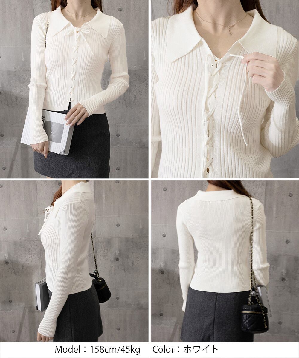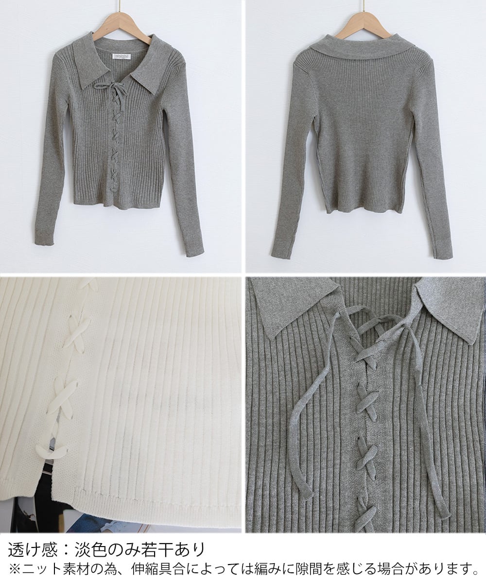 リボン編み上げが目を惹く、フェミニンムードのリブニットトップス。