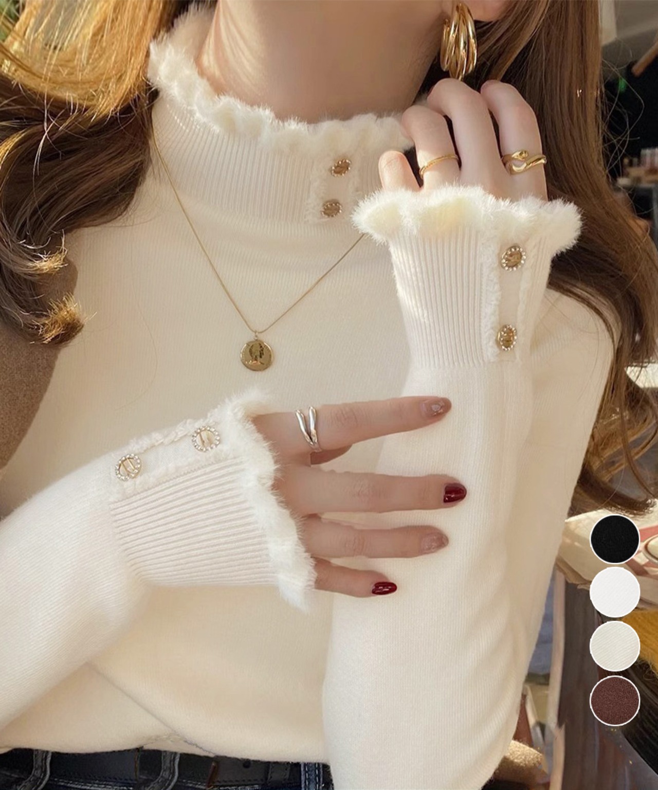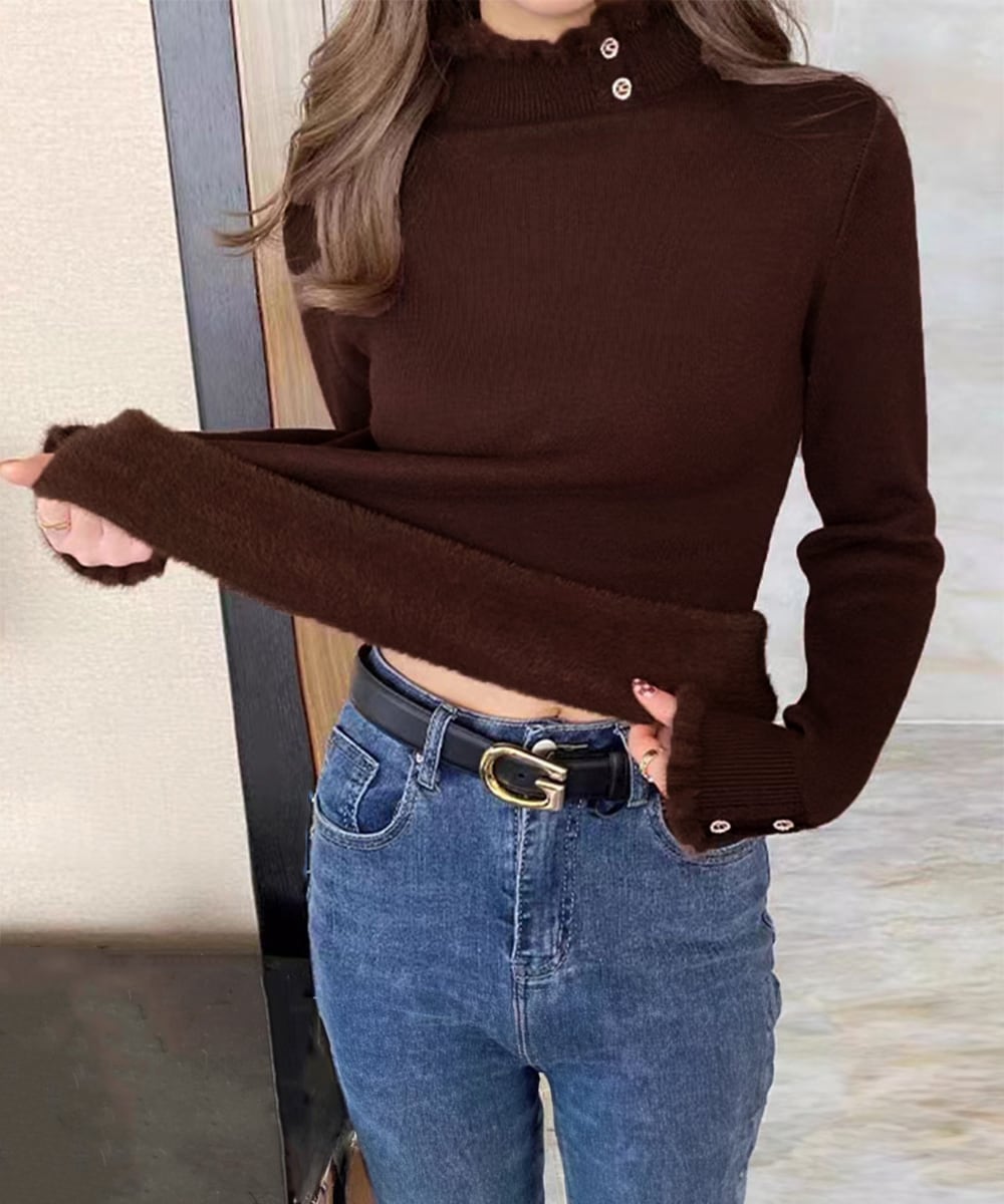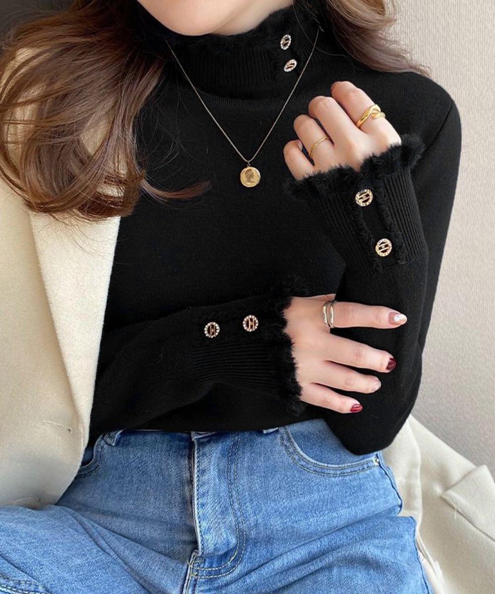 裏ファーニット防寒 フリルネックニット オフィスカジュアル