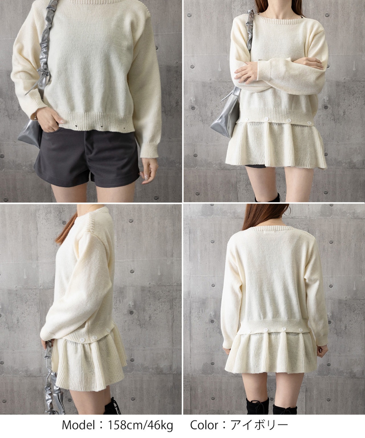 秋冬はもちろん、初春まで長く使える裾ペプラム仕様のニットトップス。