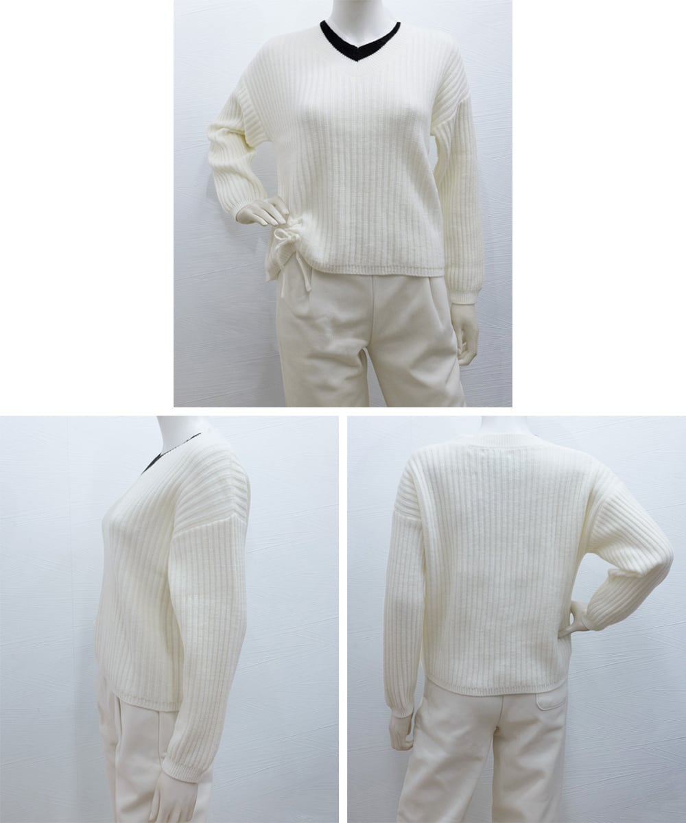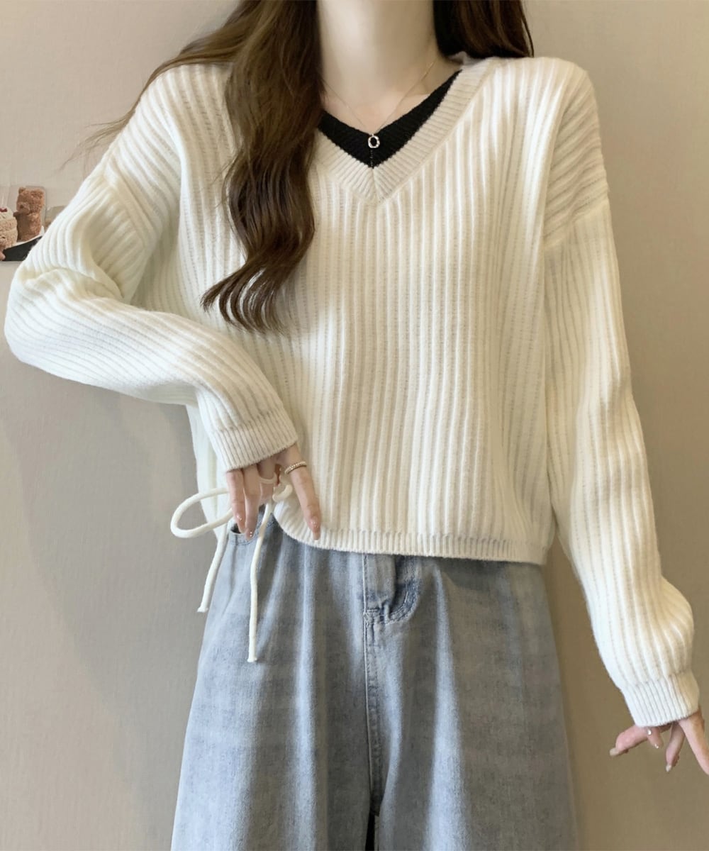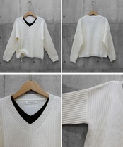 Vネックの配色レイヤード風デザインが目を引く、レディース向けリブニットトップス。