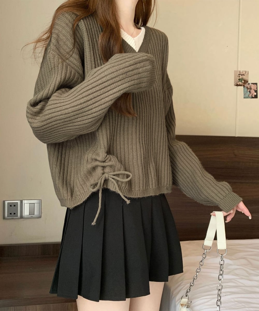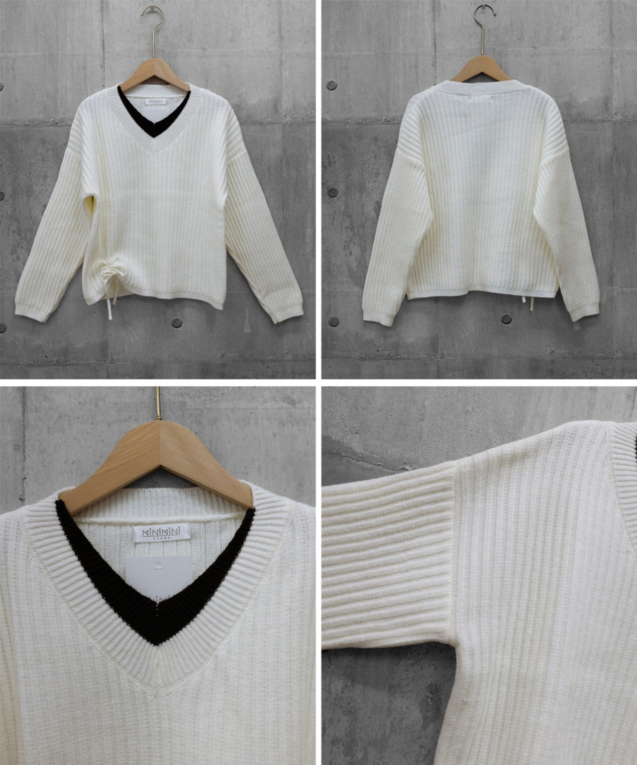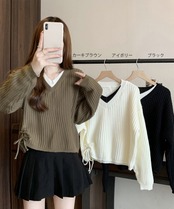 レイヤードニットレディース韓国風 きれいめトップス秋冬服 サイドドローストリングニットおしゃれ ニットセーター大人可愛い