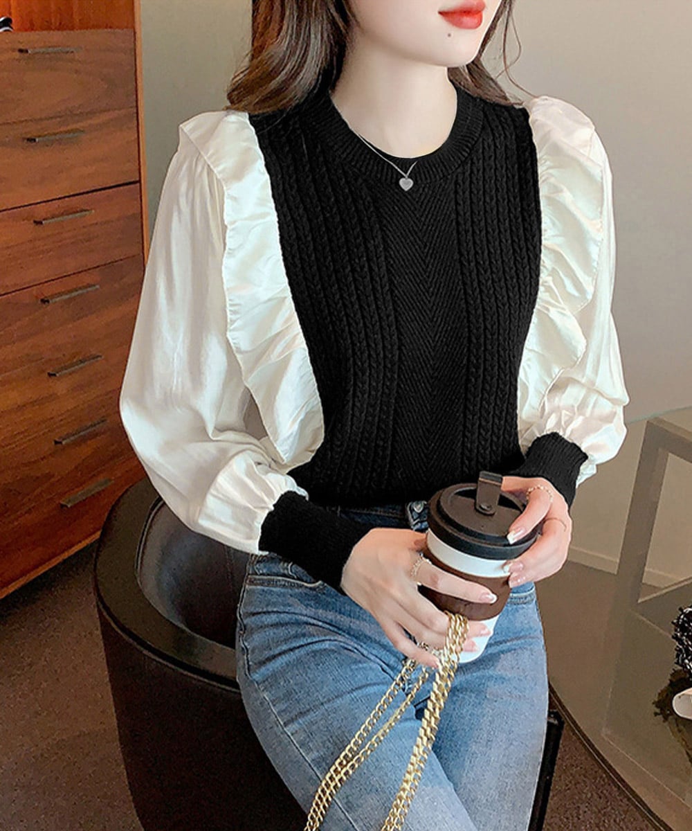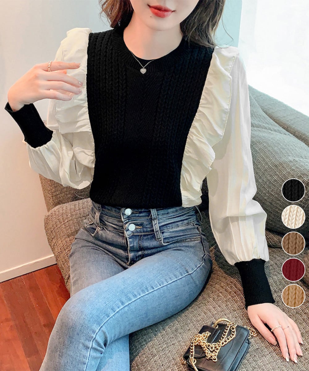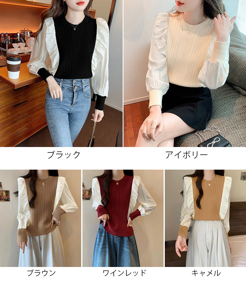 異素材mixニットブラウス レイヤード風 トップス ボリューム袖 ニットプルオーバー きれいめ ドッキングニットブラウス