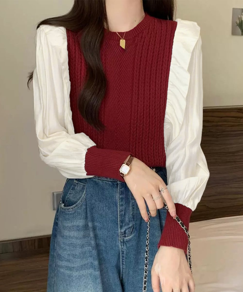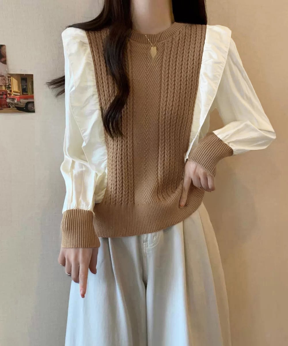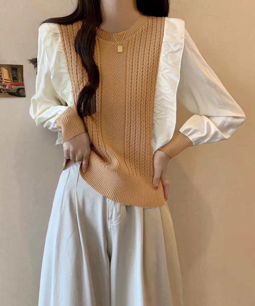 異素材mixニットブラウス レイヤード風 トップス ボリューム袖 ニットプルオーバー きれいめ ドッキングニットブラウス