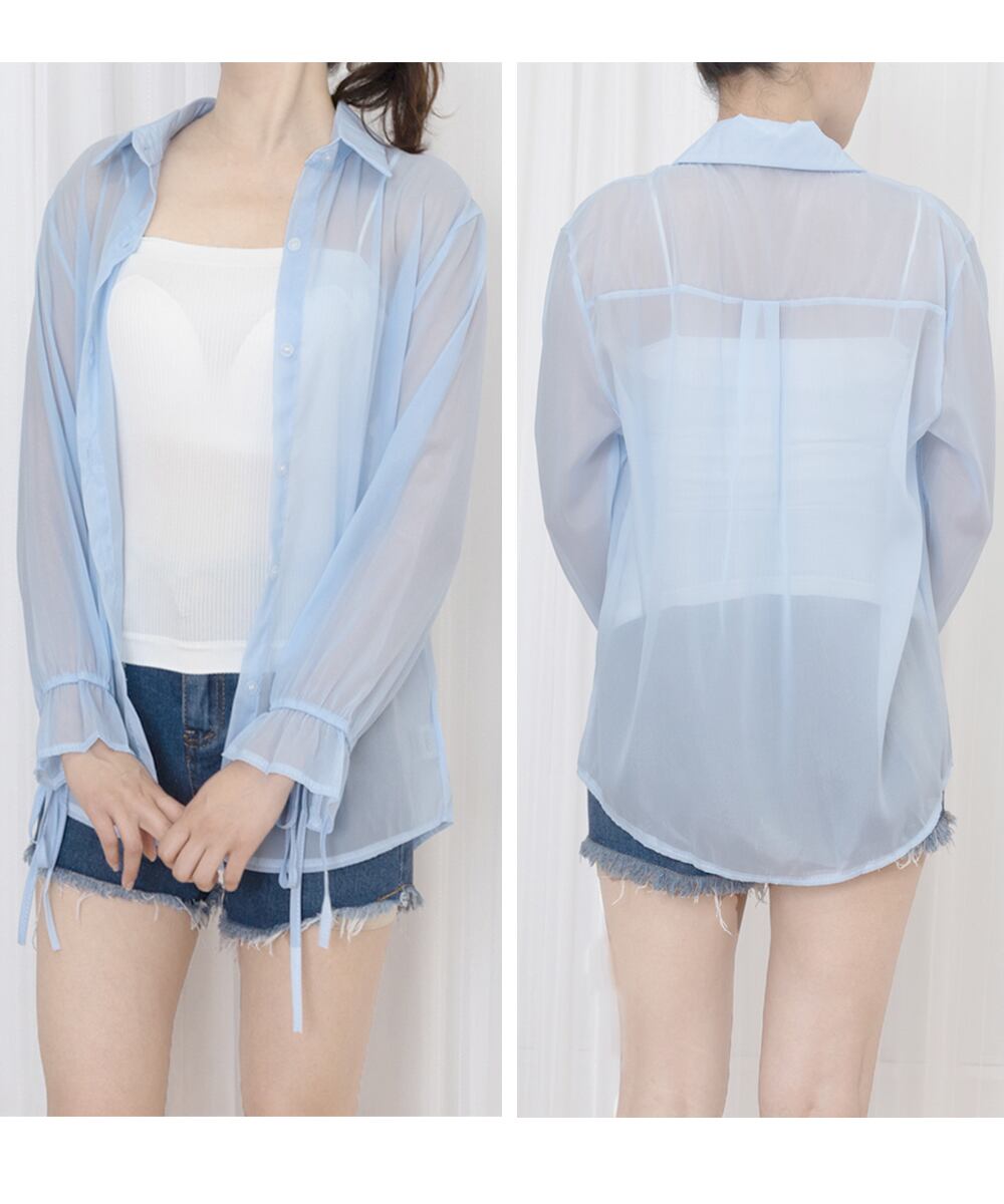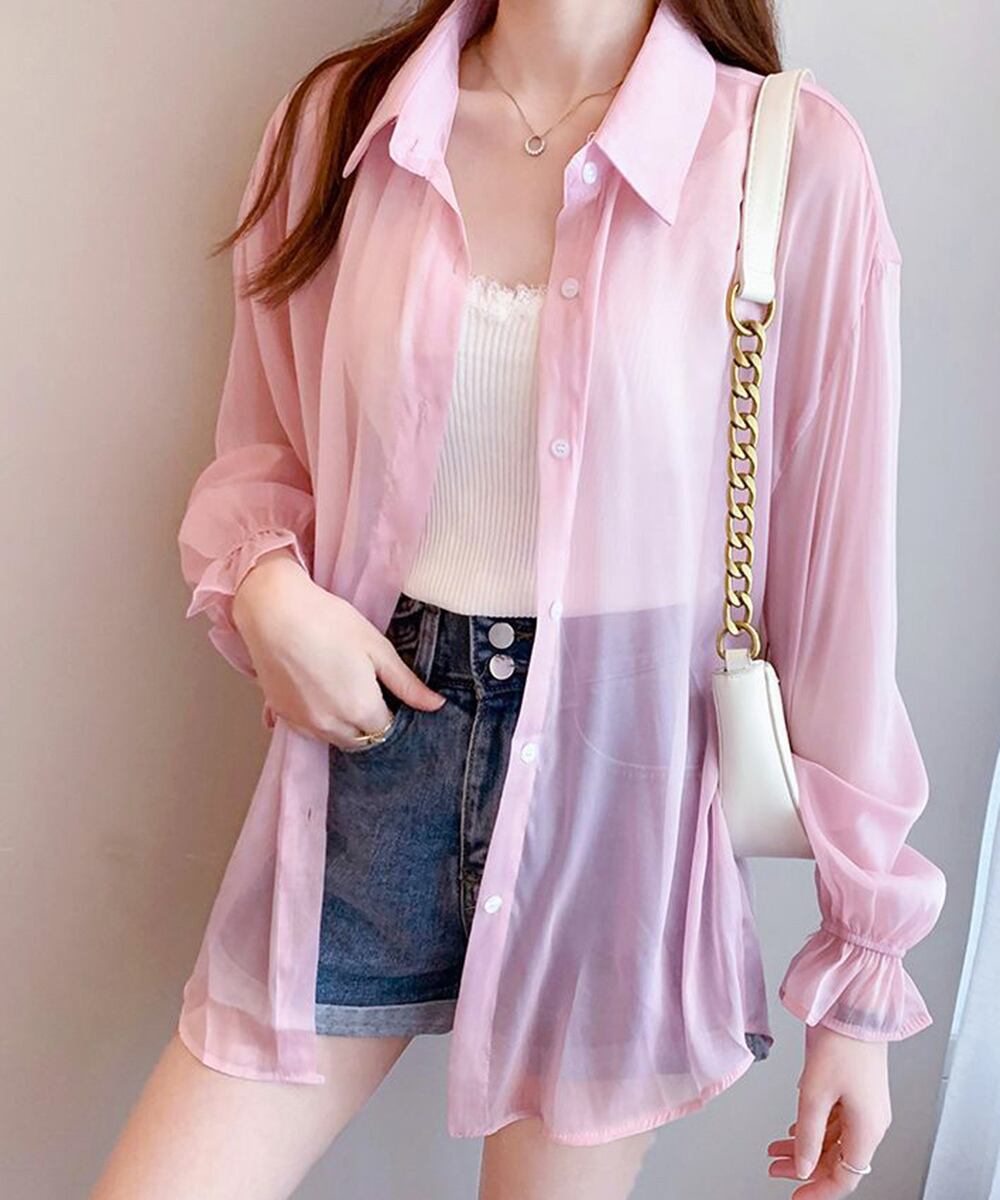 透け感のあるシアー生地が魅力の、大人可愛いシャツブラウス