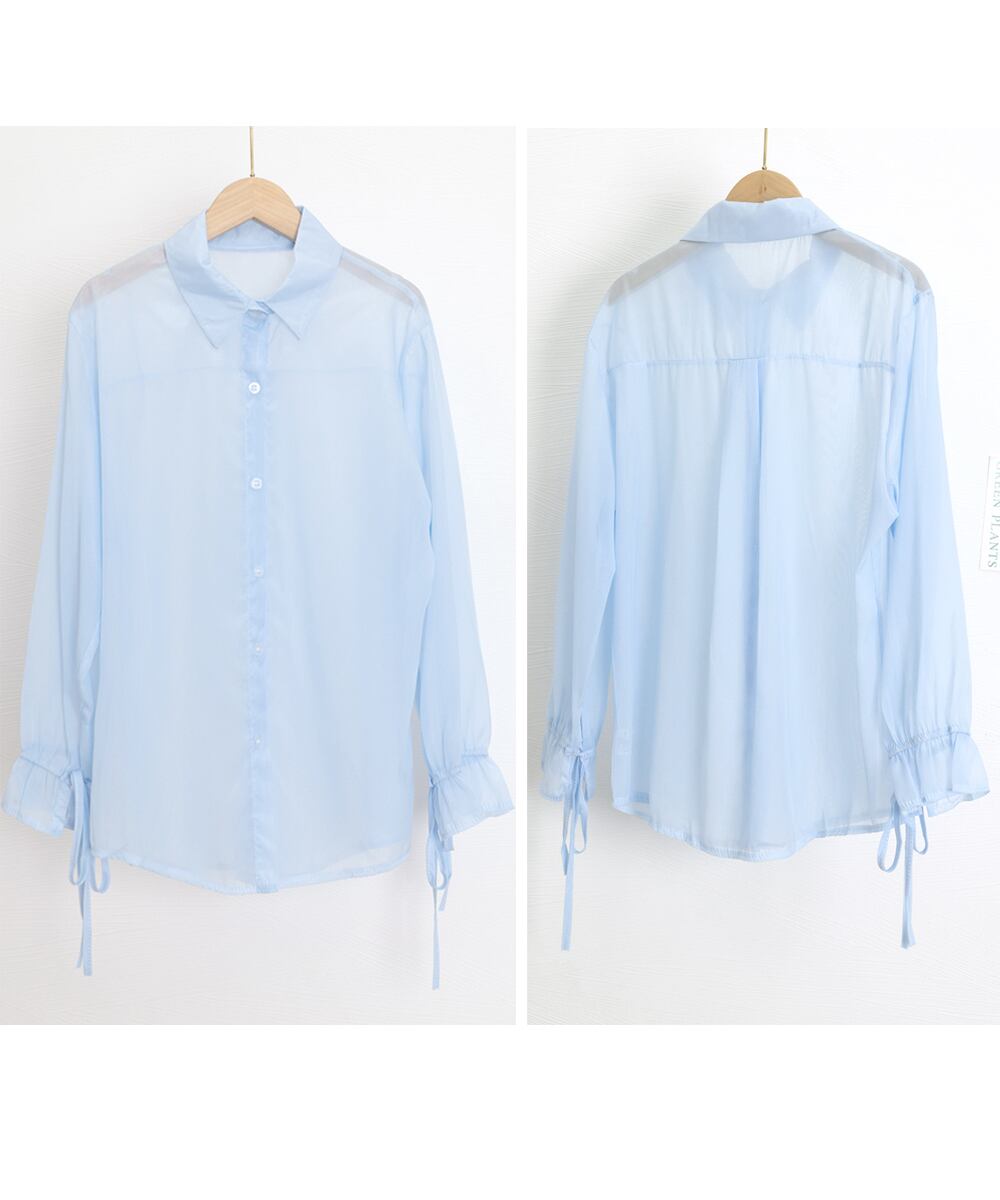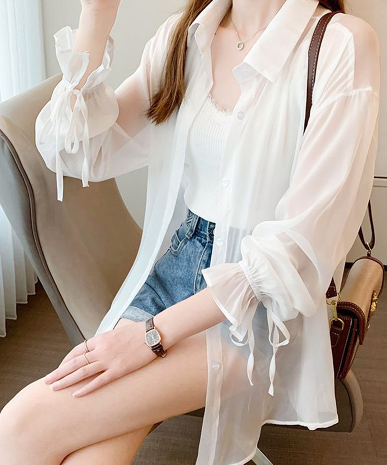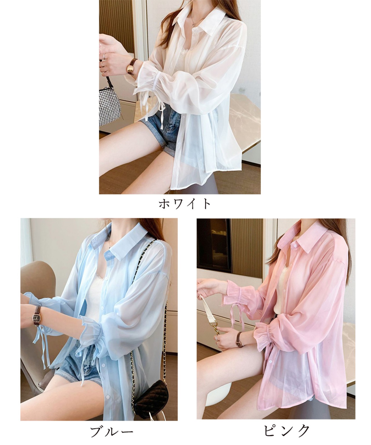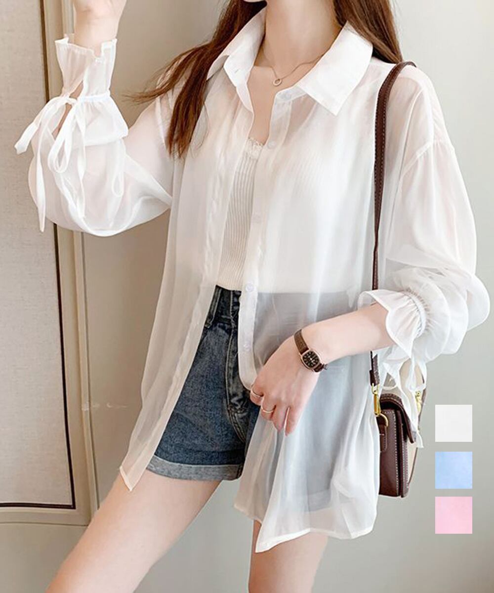 透け感シャツ ゆったり シアーカーディガン 体型カバー 長袖 シフォンブラウス 袖口リボン 羽織り 韓国風 無地トップス