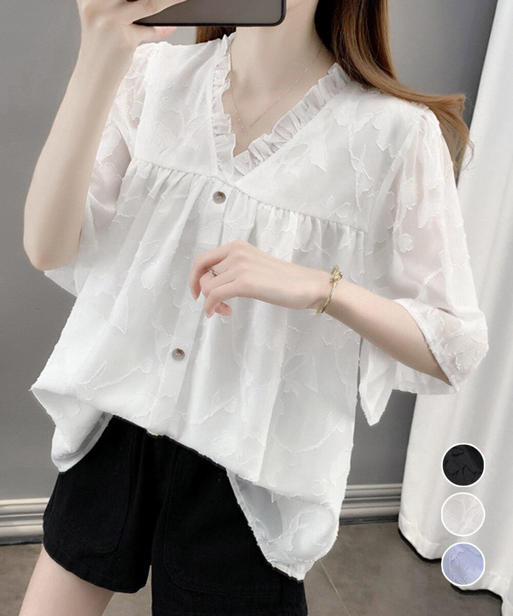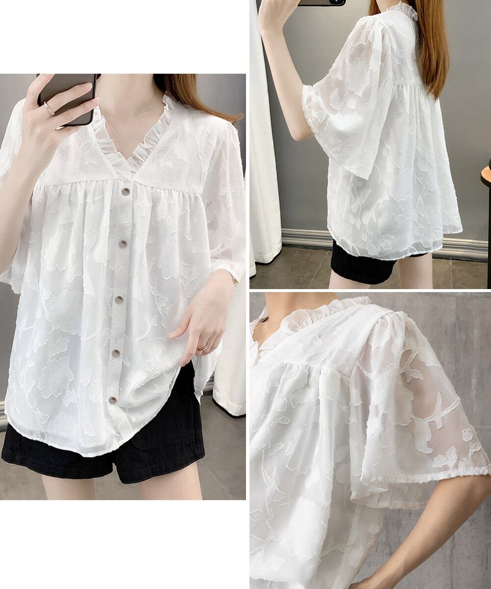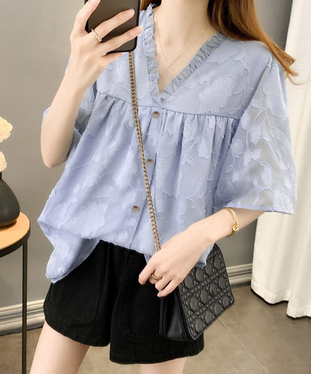 Vネックフリルブラウス 花柄刺しゅう夏服