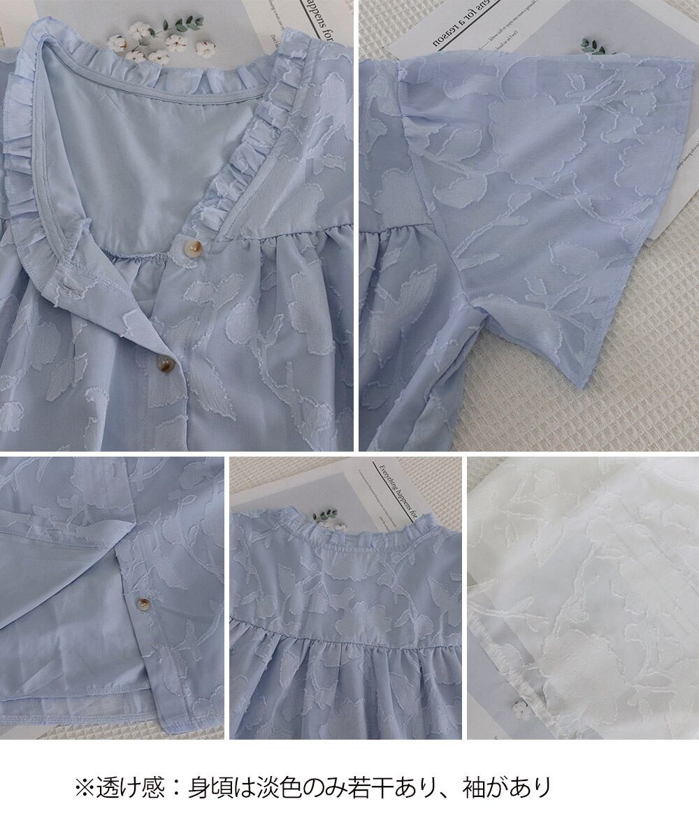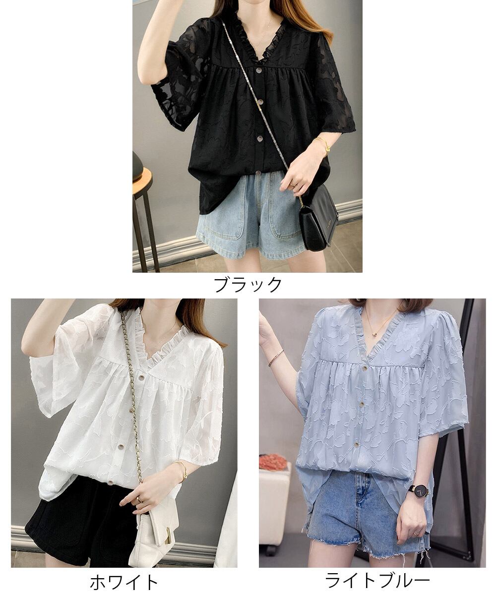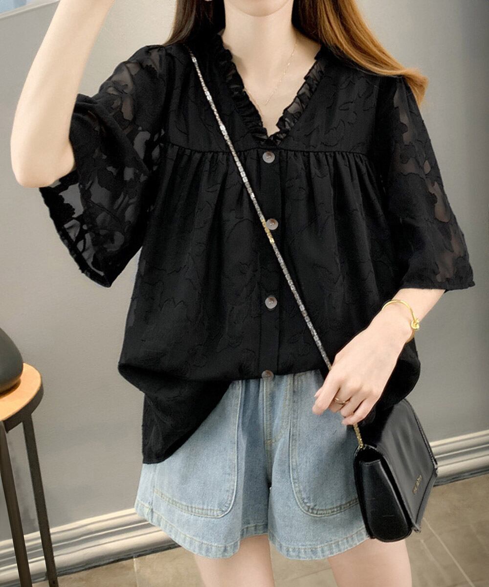Vネックフリルブラウス 花柄刺しゅう夏服