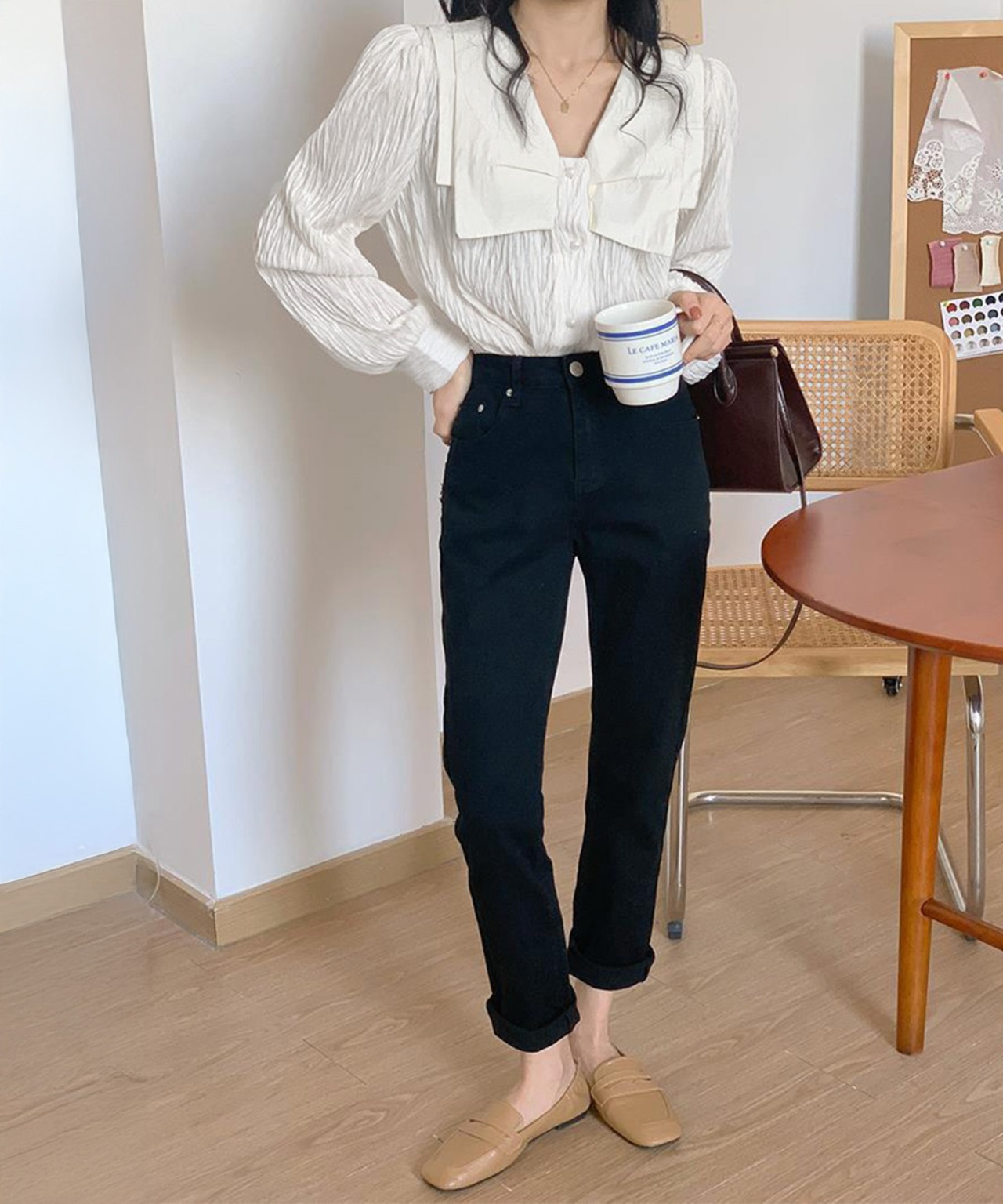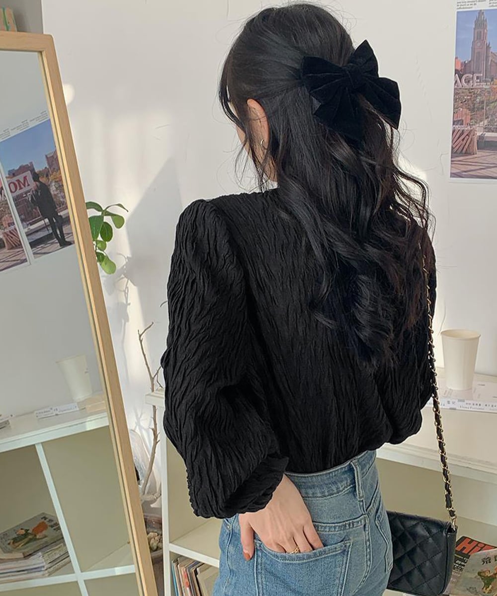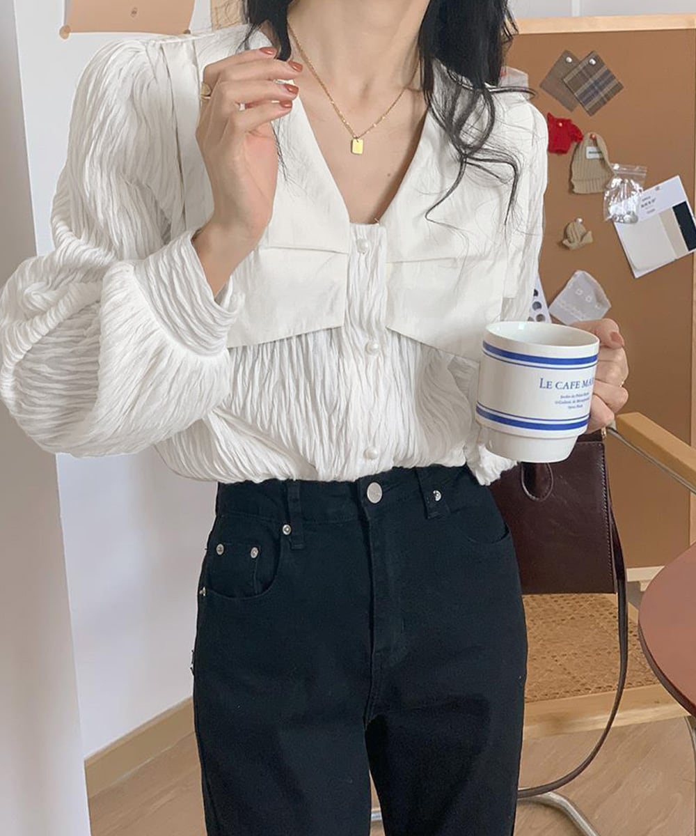 立体感のあるシワ加工がナチュラルな雰囲気を演出する韓国チックなレディースブラウス。