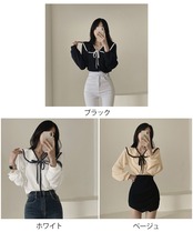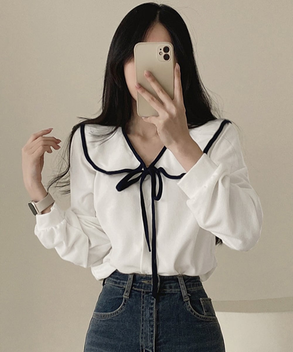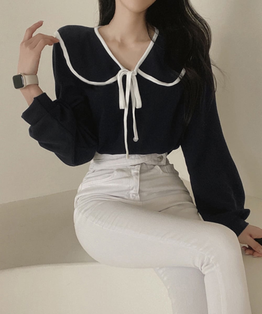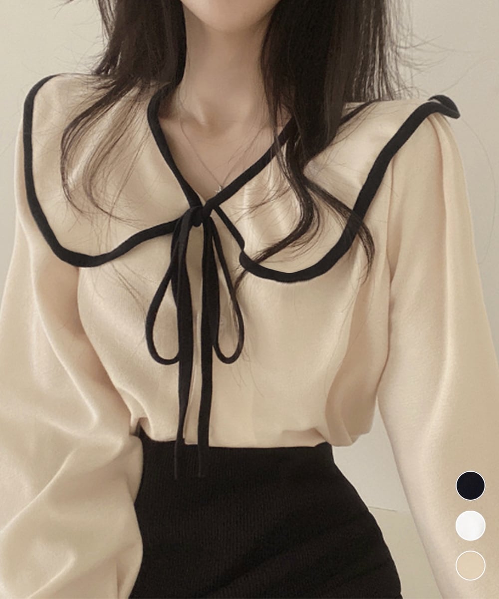 フレンチムード漂うリボンタイ付きのビッグカラーブラウス。